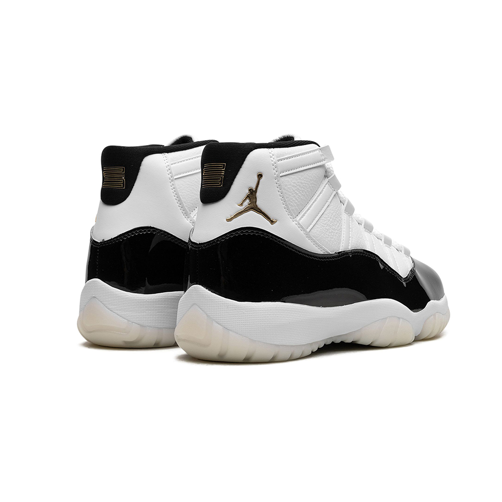 The Air Jordan 11 “Gratitude” is the modern re-release of the colorway of Michael Jordan’s eleventh signature shoe that originally released as part of the “Defining Moments Pack” from 2006. Also nicknamed the “DMP 2023” colorway, this Jordan 11 is based on the retro basketball sneaker’s original “Concord” colorway that was worn by Jordan with the Chicago Bulls throughout the team’s historic run during the 1995-96 NBA season. The upper features a white leather construction, instead of the original DMP colorway’s ballistic mesh build. A glossy black patent leather mudguard contrasts the shoe’s neutral base. Metallic Gold Jumpman branding is found on the collar while “Jumpman” detailing appears across the white mesh tongue. Underfoot, the white foam midsole and translucent rubber outsole complete the look. Release date:December 9, 2023