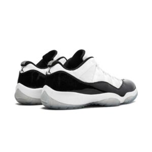 The Air Jordan 11 Retro Low ‘Concord’ reimagines the iconic OG colorway as a sleek low-top. The material build is faithful to the 1995 original, featuring a white ballistic mesh upper with a contrasting black patent leather overlay. A plush Phylon midsole is fitted with full-length Air sole cushioning and reinforced with a springy carbon fiber plate. The latter is visible through an icy translucent outsole, enhanced with purple herringbone rubber traction pods that give the shoe its name.