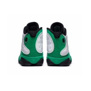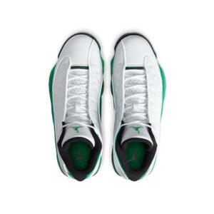 The Air Jordan 13 Retro ‘Lucky Green’ makes use of a familiar design that calls to mind Ray Allen’s coveted Air ‘Three-Point Record’ PE from 2011. The upper combines white tumbled leather with green synthetic suede, supported underfoot by the silhouette’s signature panther paw outsole in black rubber. Branding hits include a green embroidered Jumpman atop the tongue, matching the circular hologram on the lateral ankle.
