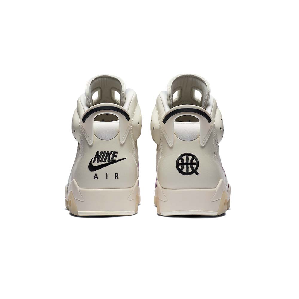 The Air Jordan 6 “Quai 54 – Purple” was released by Jordan Brand in 2020 to coincide with the annual streetball tournament in Paris, France. One of two “Quai 54” colorways of Michael Jordan’s sixth signature shoe, this design displays a Sail leather base with underlying patterned textile panels with purple, orange, and black accenting on either side. Black embroidered Jumpman branding can be found on the purple nylon overlay on the tongue. Jordan Brand opts for a purple lace toggle with mini black Jumpman detailing and co-branded “Nike Air” and “Quai 54” embroidery on the left and right heel, respectively. A clear Air unit is encased within the heel for a timeless appearance. Release date: July 2020.