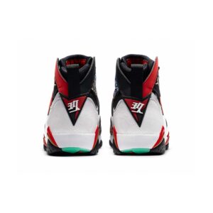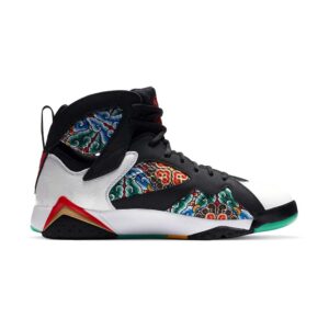 Dressed in a White, Chile Red, Black, and Metallic Gold color scheme. This Air Jordan 7 features a Black nubuck upper with a glazed tonal dragon motif on the lateral, the pattern continues on the White tumbled leather overlays. Red nubuck around the lateral collar completed with Metallic Gold embroidered Jumpman. The medial sports a Chinese traditional colorful artwork on the underlay with soft Black leather overlays. Chinese Kanji motifs on the tongues and heels completed with glow-in-the-dark soles.