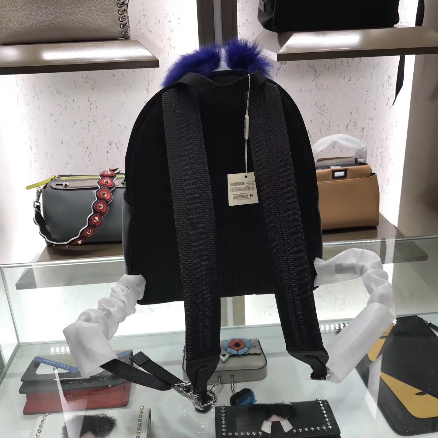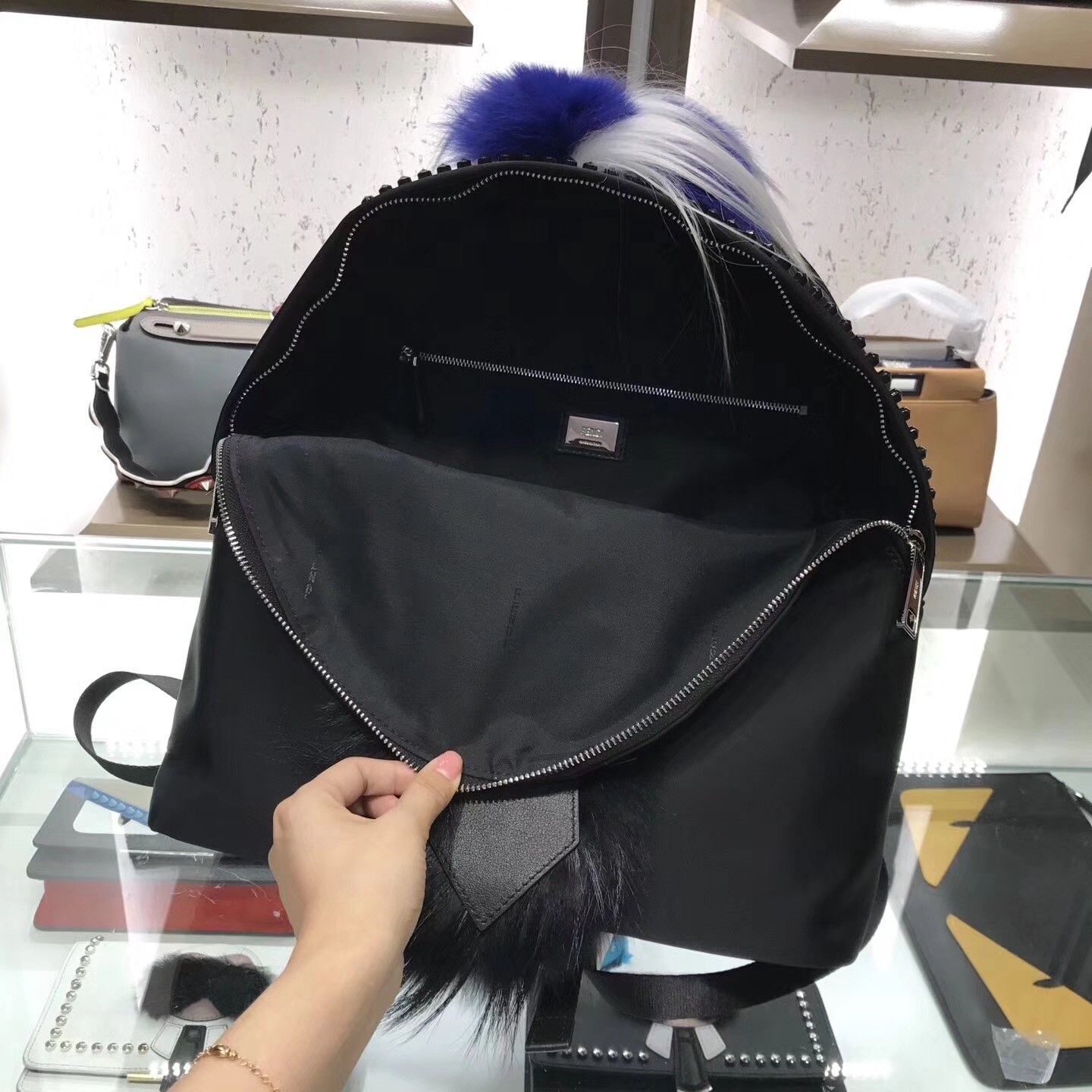 – Appliqués in leather and fur that depict Karlito