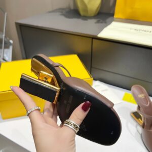 – Diagonal F-shaped sculpted heel in gold-colored metal