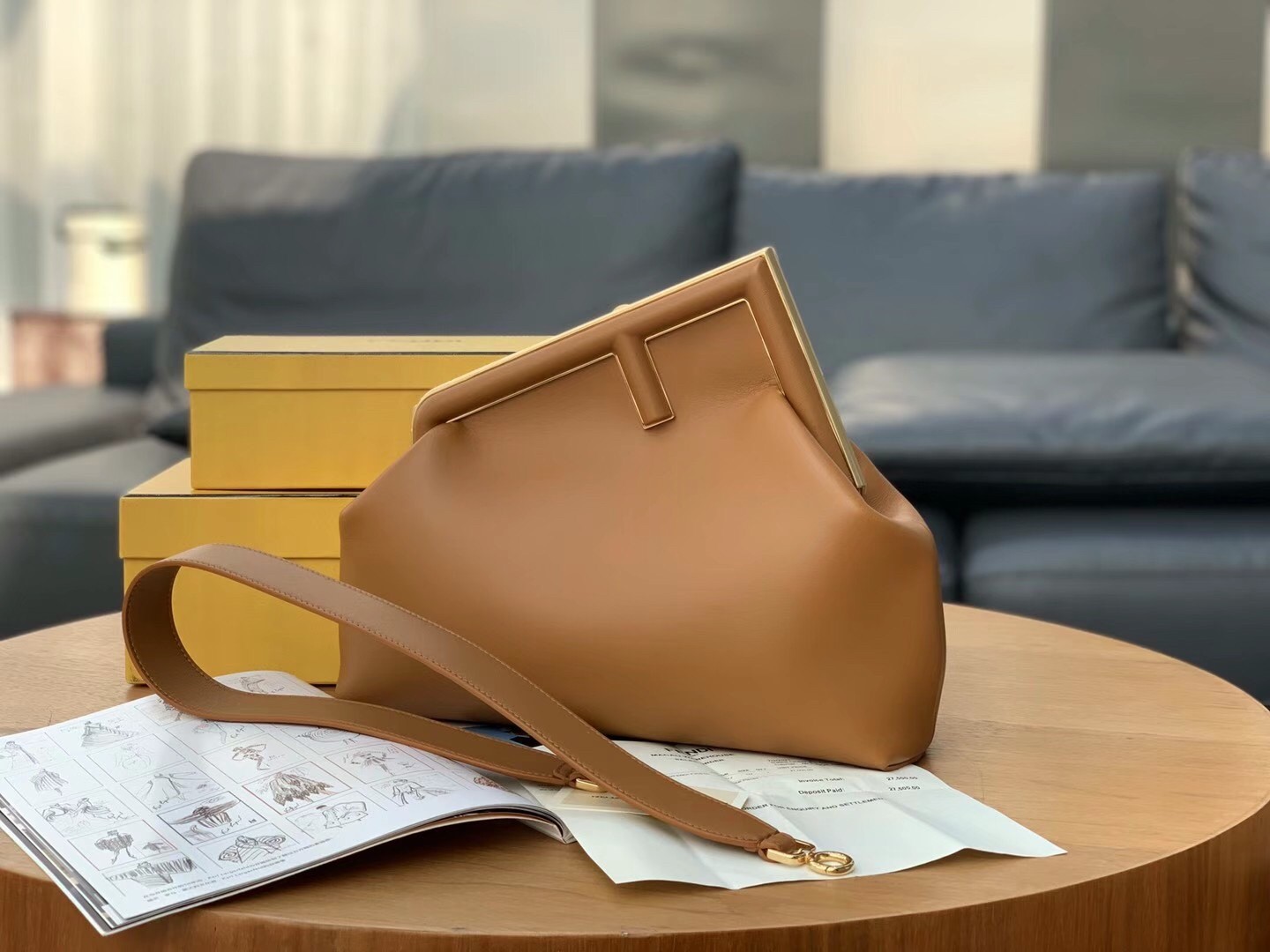 – Oversized metal F clasp bound with tone on tone nappa leather