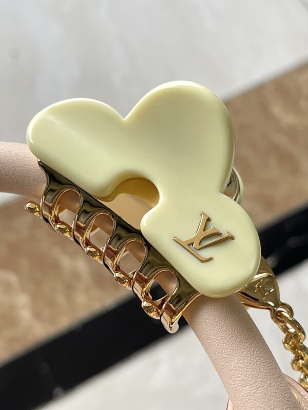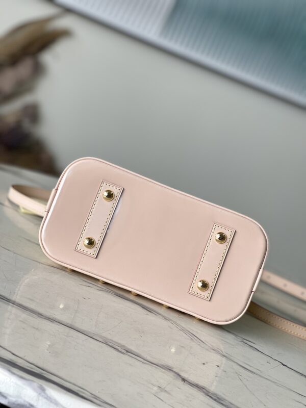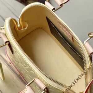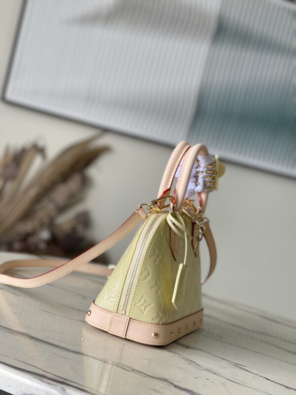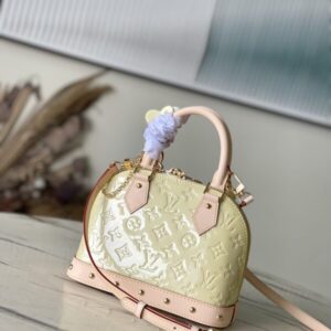 Alma BB handbag is made of glossy Monogram Vernis leather to create a chic Art Deco style structure, with cowhide leather handles and lower edge. Metal rivets embellish the handle fixing position and bottom trim, and the bright hair clip adds a trendy touch.