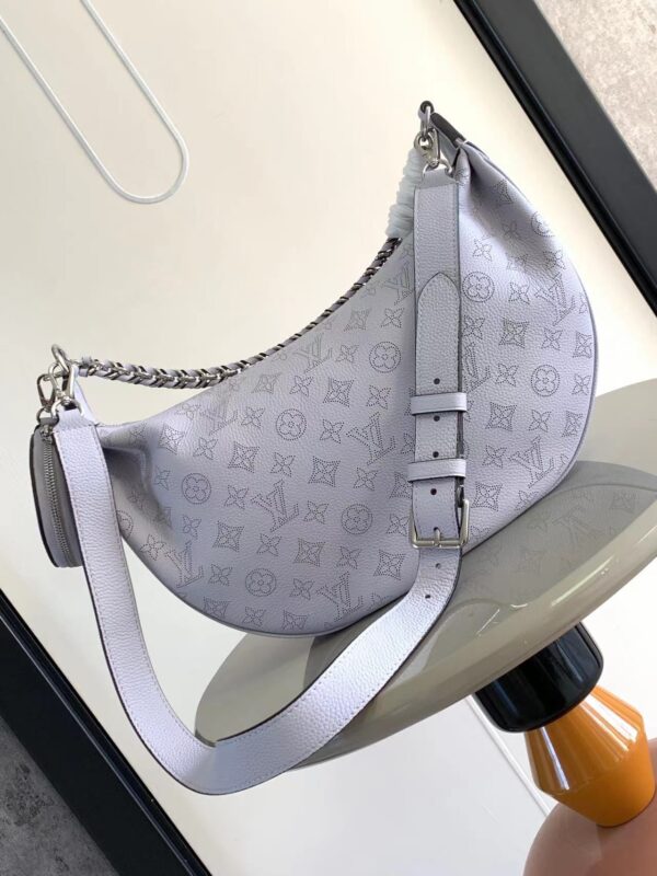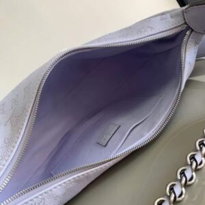 Made from soft and draped perforated cow leather, it joins the Mahina series in a comfortable and close-fitting half-moon silhouette. The leather and metal braided handles combined with the long adjustable shoulder strap allow for shoulder or cross-body carry options, and the coin purse is rich in details.