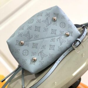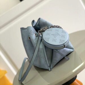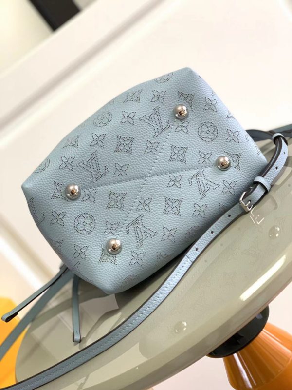 Light blue BELLA handbag Bella bucket bag is made of Monogram perforated calfskin to create a small shape, and then make the same pattern live in a round coin purse in a pocket scale, full of modern style. Braided metal and leather handles and a detachable leather shoulder strap allow for versatile carrying options.