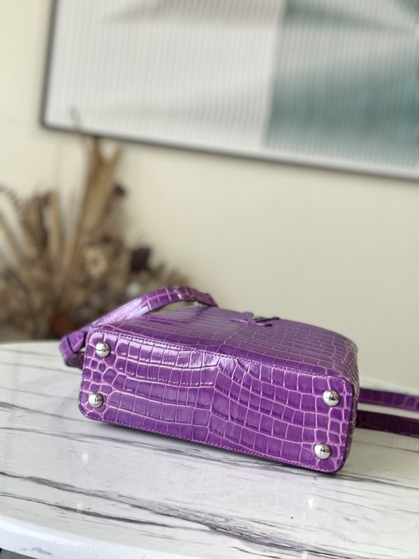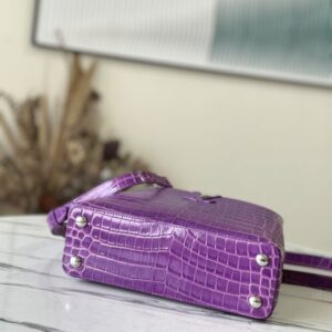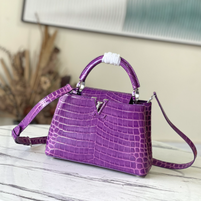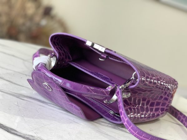 Purple crocodile silver buckle This precious Capucines BB handbag is made of crocodile leather with high-gloss treatment to shine. Luxurious goatskin lining and gleaming metal accessories. Unique Capucines flap can be included in the bag The letter logo is displayed inside and the Monogram Flower pattern can be turned inside out. Ideal accessories for night out.