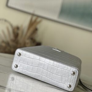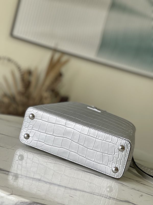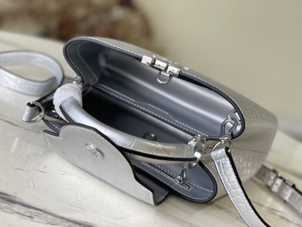Silver crocodile print This precious Capucines BB handbag is made of crocodile leather with a high-gloss finish to shine. Luxurious goatskin lining and shiny metal accessories. The unique Capucines flap can be stored inside the bag. Displays the letter logo and can be turned inside out to present the Monogram Flower pattern Ideal accessory for night out
