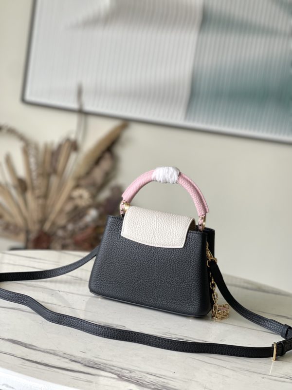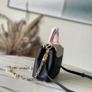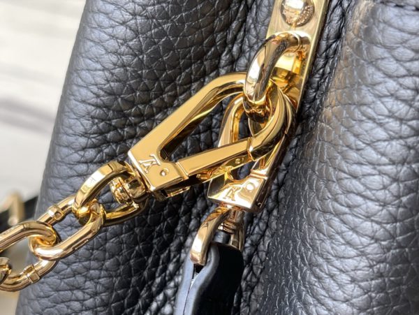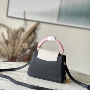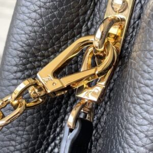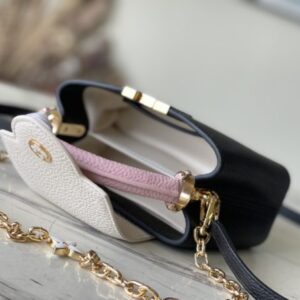 This Capucines handbag is made of Taurillon leather, which faintly reflects the shades of the same color, making the classic shape more eye-catching. With the enamel Monogram floral chain, it can be carried by hand, on the elbow, or on the shoulder strap.