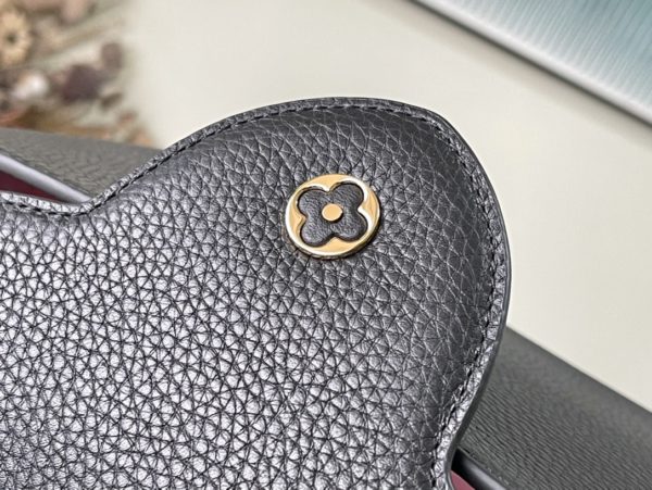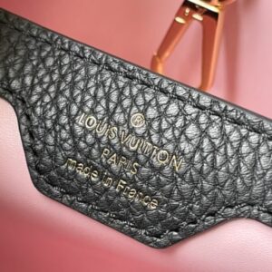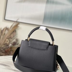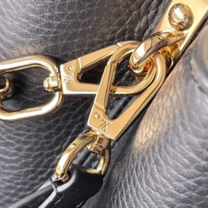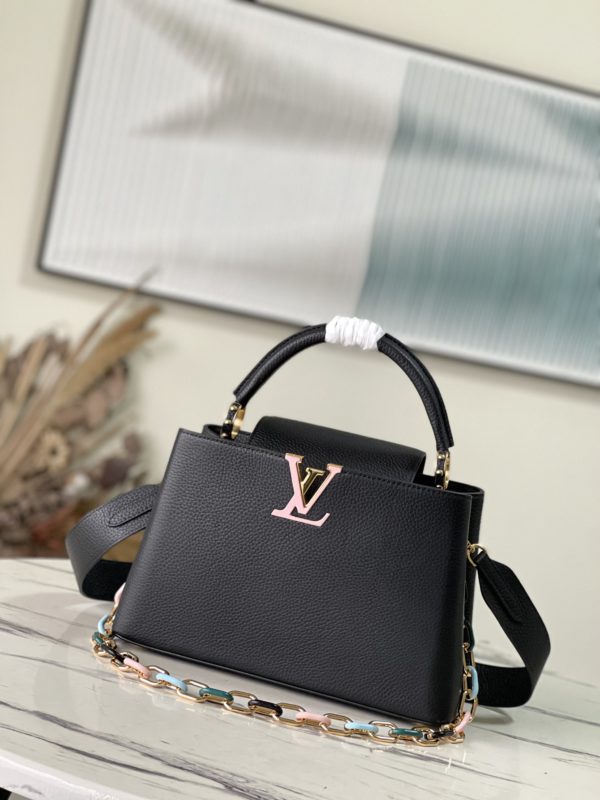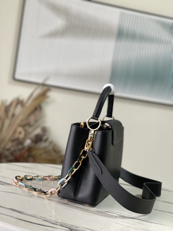 Black Medium This Capucines medium handbag is made of Taurillon leather, and the metal and resin links are interlocked with each other. The top handle and detachable wide shoulder strap add a fun carrying method. The signature flap of the Capucines collection is folded in to reveal the logo.