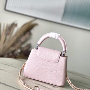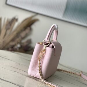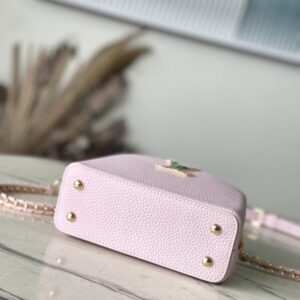 Pink small Capushine series launches this Capucines mini handbag. The luminous Taurilon leather presents a lustrous texture through the spray-painting process, admiring the warm sunshine above the first snow in winter and under the wine. Lettering and handle rests feature a chic gloss inspired by ski goggles.