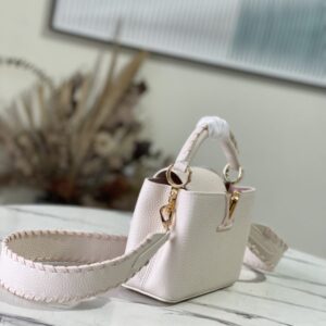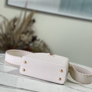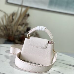 Creamy white with light pink webbing style This Capucines mini handbag focuses on exquisite craftsmanship Taurillon leather bag body and handle and shoulder strap color details reflect contrast Metal texture leather wrapped V letter Capucines series flap can be outside Set or retract.