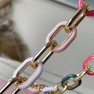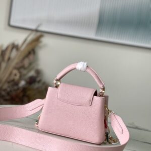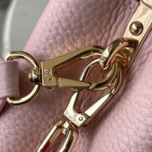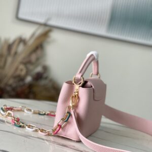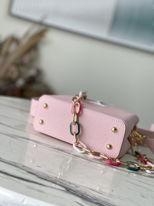 Pink Mini This Capucines mini handbag has metal and resin links interlocking for a playful twist on a classic design with a removable chain. Taurillon leather has a lustrous look, and the flap is placed on the inside to reveal the logo.