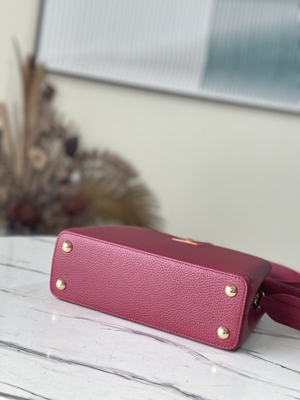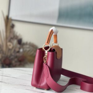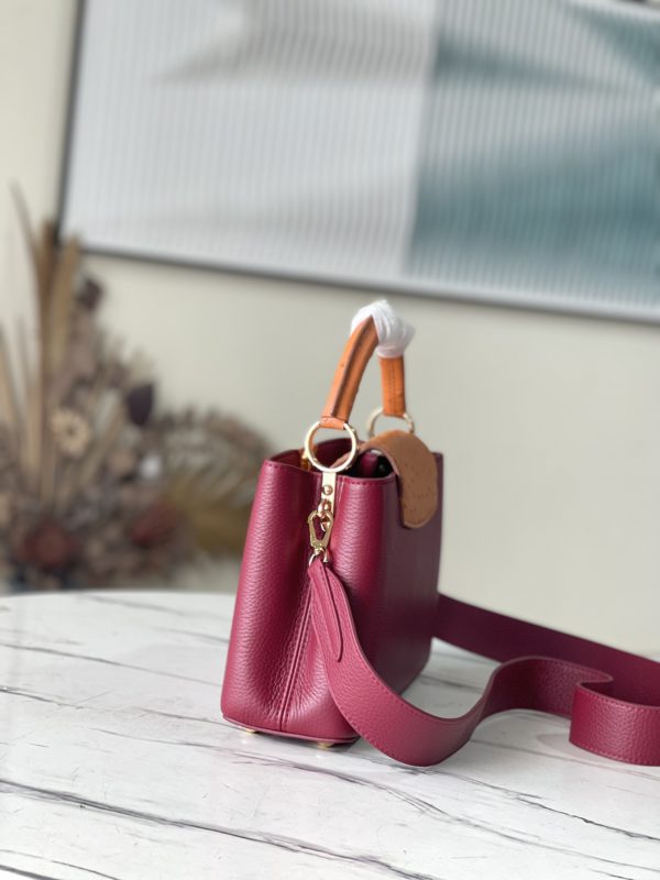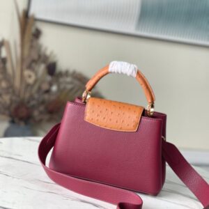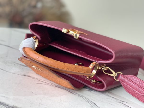 This Capucines small handbag is made of Taurillon leather to shape the exquisite shape, and the flap, handle and L letter are wrapped in ostrich leather. Modern style.