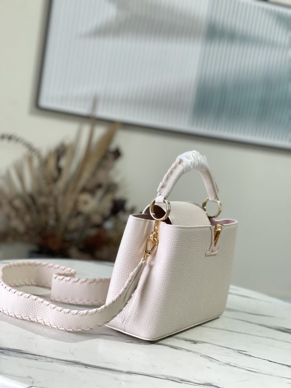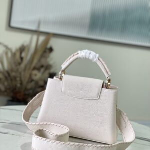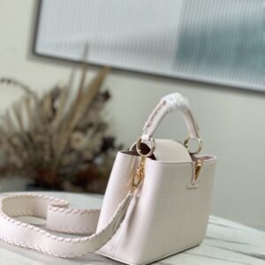 Creamy white with light pink webbing style This Capucines BB handbag focuses on exquisite craftsmanship Taurillon leather bag body and handle and shoulder strap color details reflect contrast Metal texture leather wrapped V letter Capucines series flap can be external or adduction.