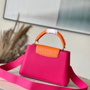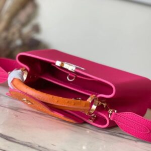 This Capucines handbag is made of Taurillon leather to create a delicate shape. The flap, handle and LV letter flap are wrapped with ostrich leather. The flap can be placed outside or inside to read the LV logo. The removable wide leather shoulder strap is full of modern fashion.