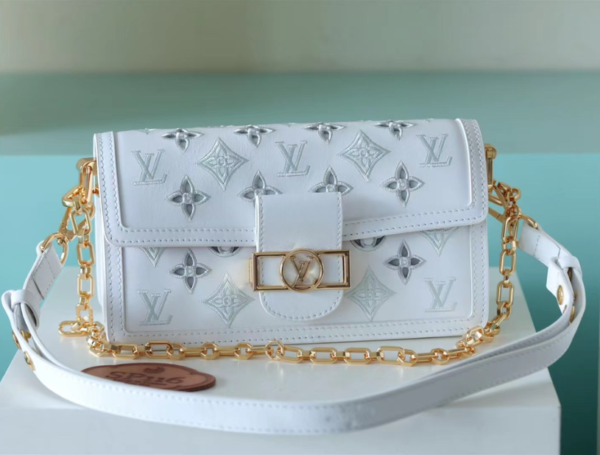 s of the classic Dauphine handbag series: the early spring series is an improved version designed by Nicolas Ghesquière, the artistic director of women’s wear. It combines Monogram canvas and Monogram Reverse canvas with chain shoulder strap and magnetic lock. M20730 light coffee color m20739 white full leather embossing Hollow flower embroidered chain shoulder straps Double shoulder straps Horizontal Daphne Show brand tradition in a modern style Show Louis Vuitton’s fashion endowment Ideal for lovers of Monogram canvas.