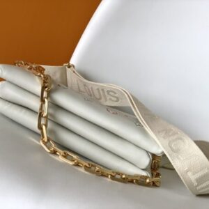 This Coussin small handbag is made of Monogram embossed sheepskin, which subtly integrates floral patterns into LV letters and Monogram flowers. Carry it on the shoulder by the chunky chain or attach the wide adjustable webbing strap to wear it cross-body.