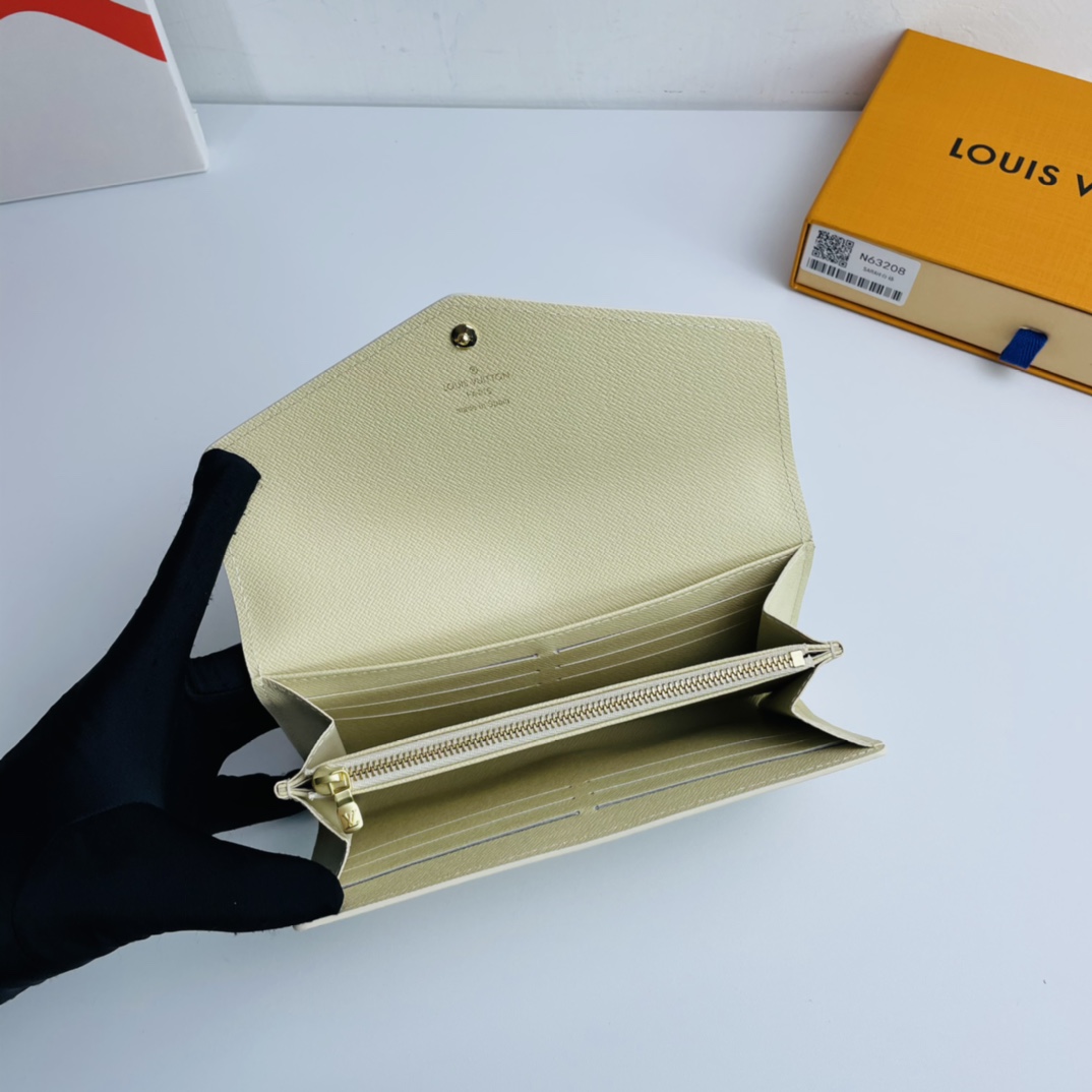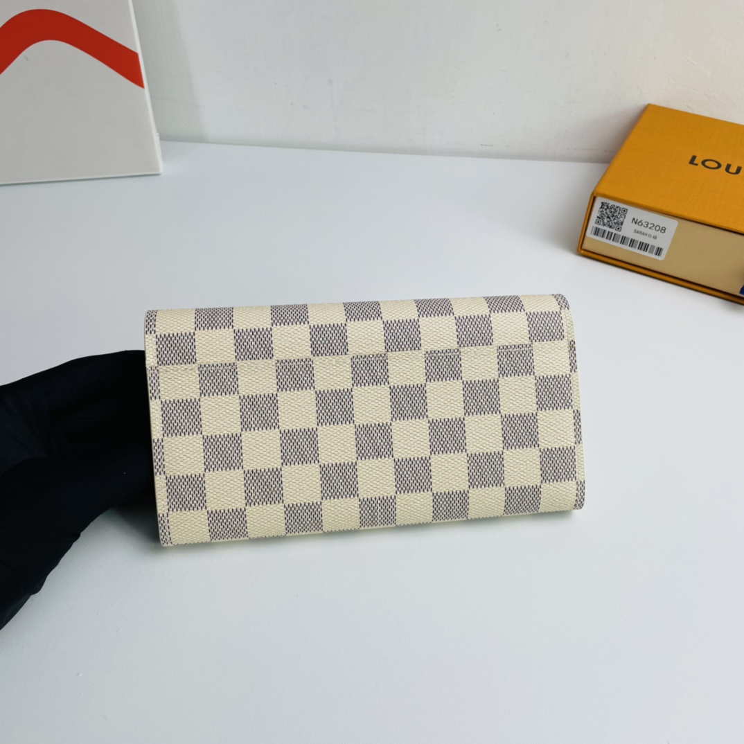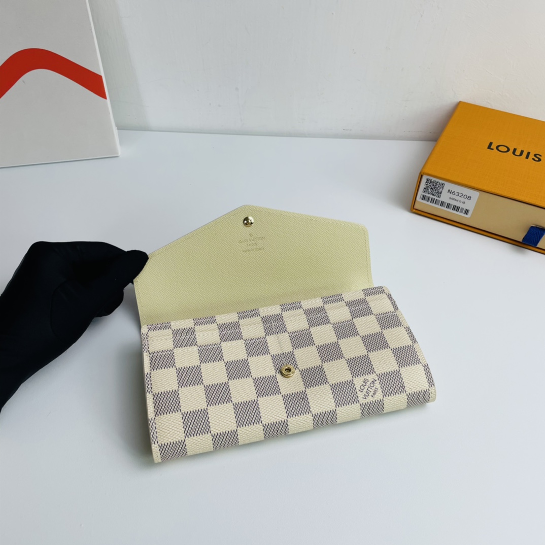 Exclusive real shot! The envelope style Sarah Wallet combines an elegant Damier Azur canvas exterior with a thoughtfully structured interior that offers multiple interior pockets and credit card slots.