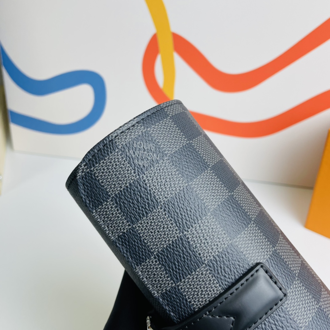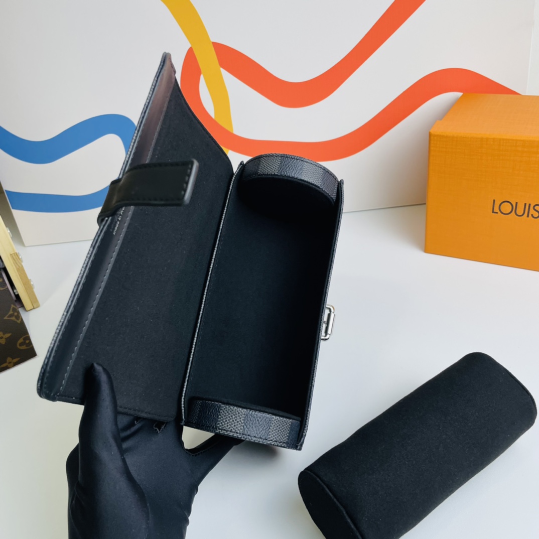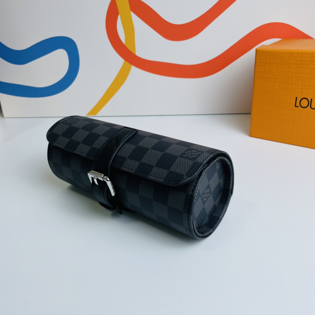 This 3-piece watch case in Damier Graphite canvas provides soft all-around protection for up to 3 men’s watches and fits easily into a suitcase or handbag, making it an elegant travel accessory.
