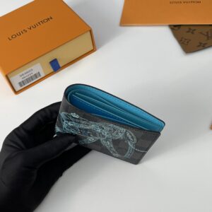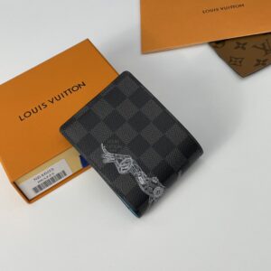 This Slender wallet showcases the exotic style of the Louis Vuitton stamp theme. The image of a running elephant is composed of Damier Graphite canvas against the passport stamp pattern, continuing Louis Vuitton’s travel heritage and is an ideal gift for travel lovers.