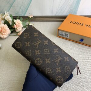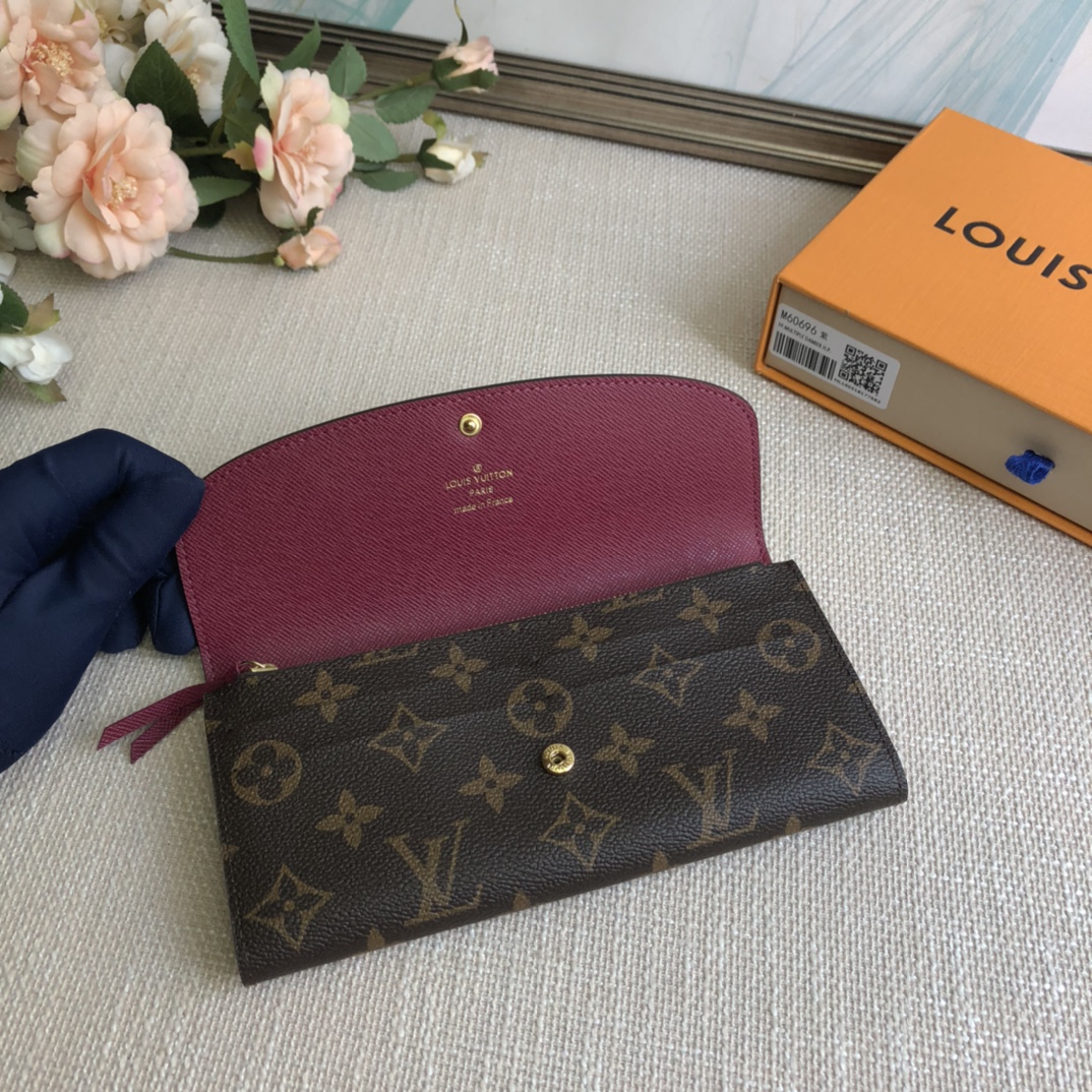 Purple red Doudou wallet exclusive real shot! Functional and richly designed, the Emilie Wallet is crafted in supple Monogram canvas with a vibrantly colored interior for ultimate elegance. The multi-pocket design and striking shape lend it irresistible allure.