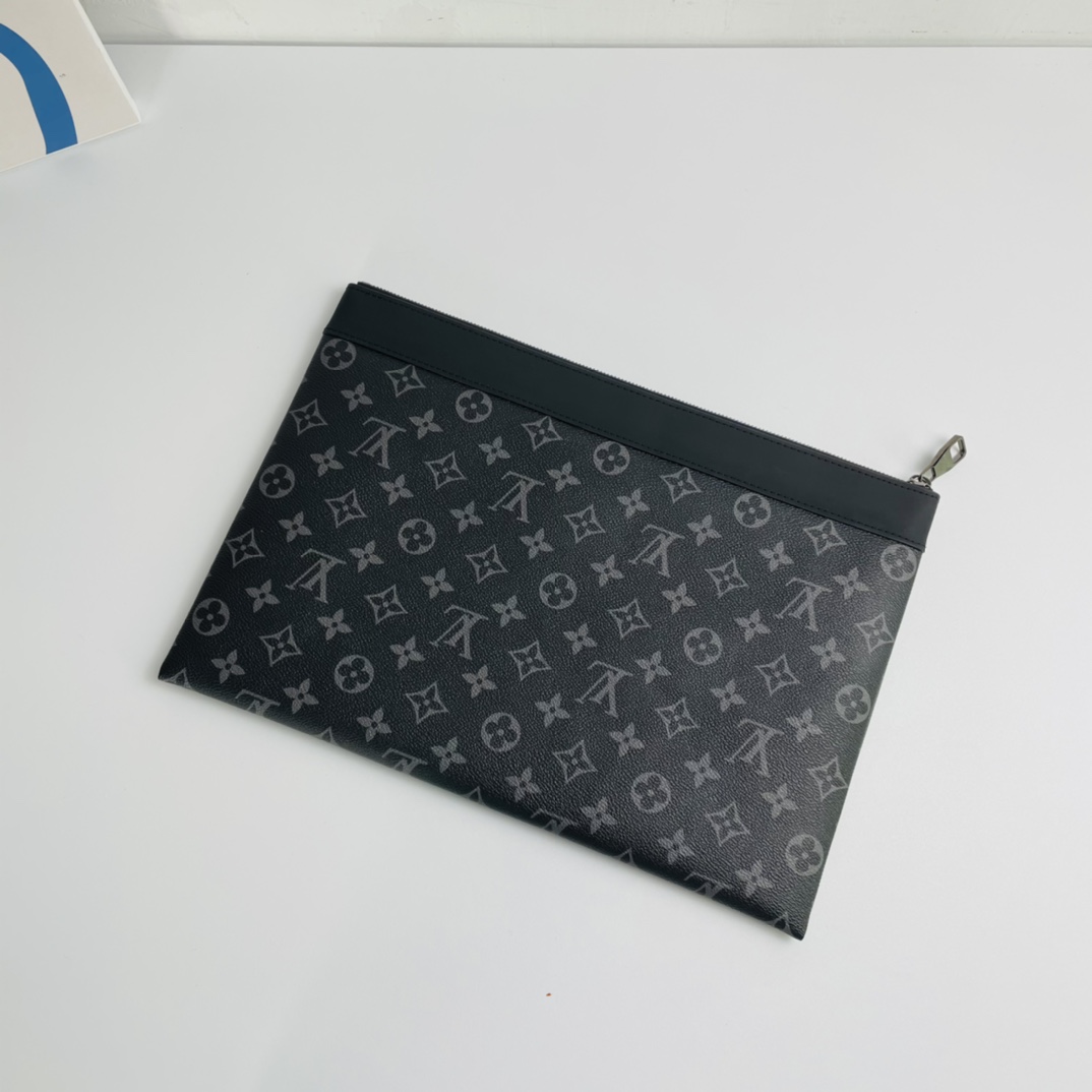 Crafted from soft Monogram Eclipse canvas, this bag is compact and functional for storing documents and other personal belongings. Elegant and stylish, it can be held by hand or carried in a bag. All-steel hardware, matching gun-colored zippers.