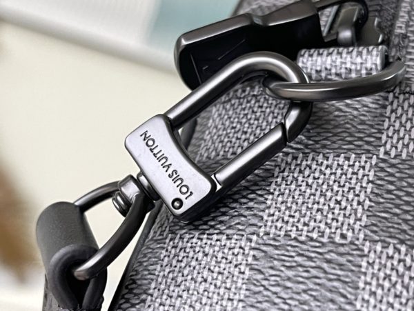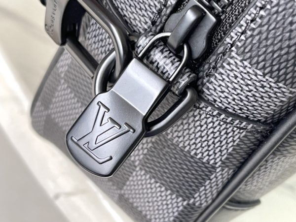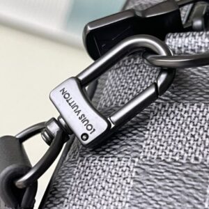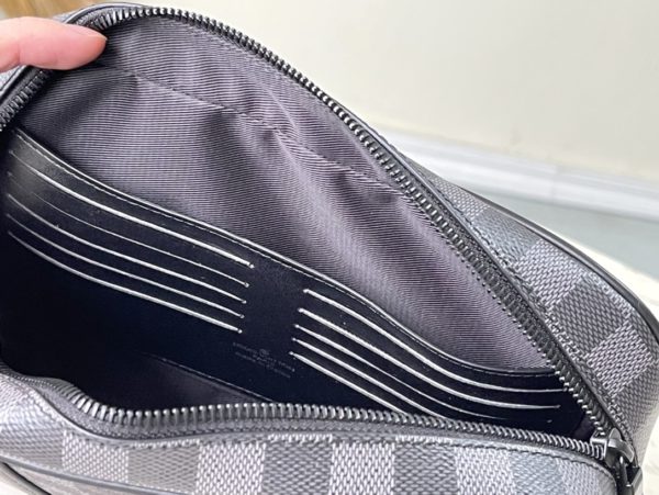 Black Grid Men’s Bag Clutch Clutch Collection POCHETTE KASAI Clutch This Kasaï pouch is made of Damier graphite canvas, with reinforced corners and black leather straps on the front, and a zip back pocket. Its wide zip opening provides access to three flat pockets and ten card slots. The piece can be worn as a bag or on the wrist with its detachable strap.