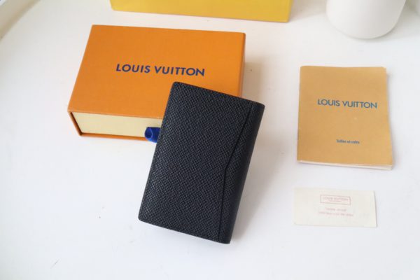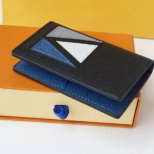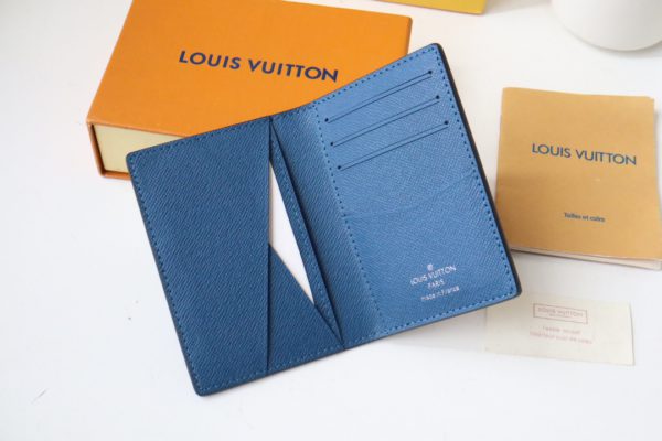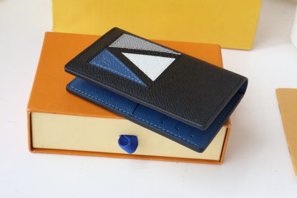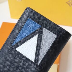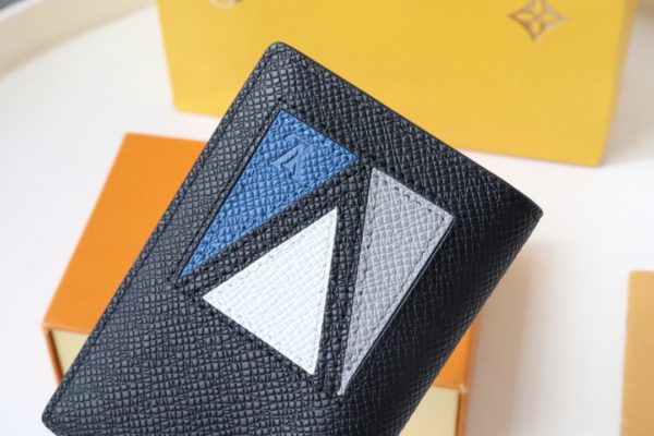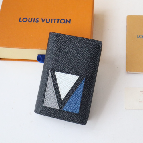 This pocket wallet features marquetry in which the V pattern is embedded in fine Taïga leather, echoing the traditional Louis Vuitton logo in vibrant colors. The slim shape hides plenty of room and slips easily into your pocket.