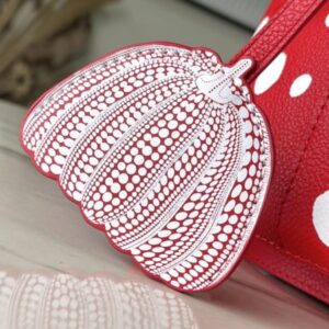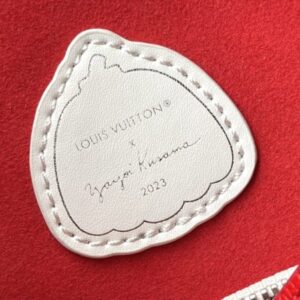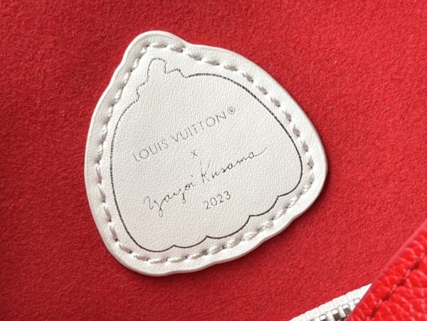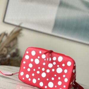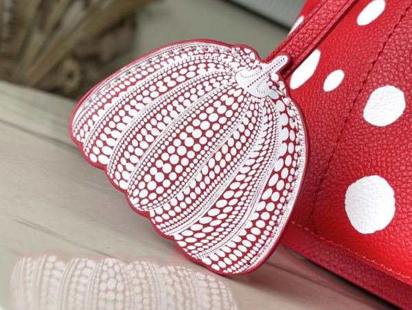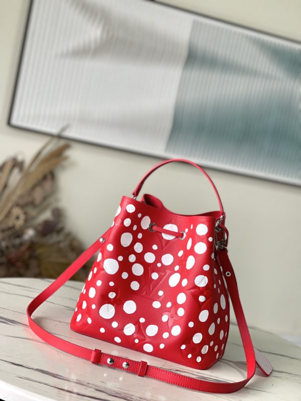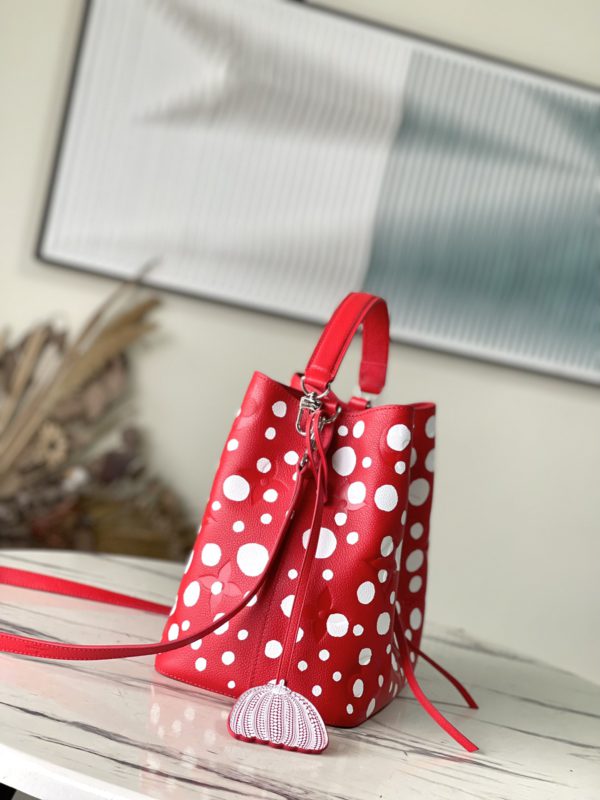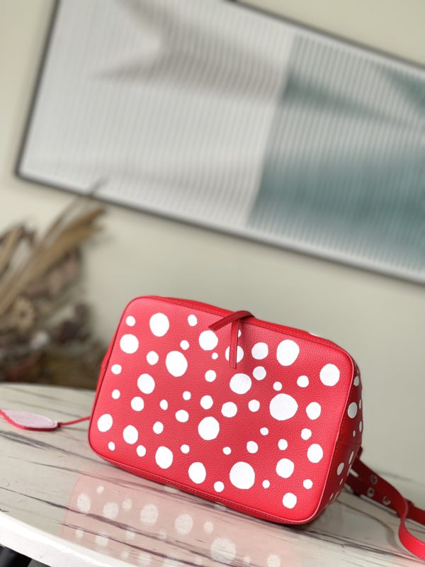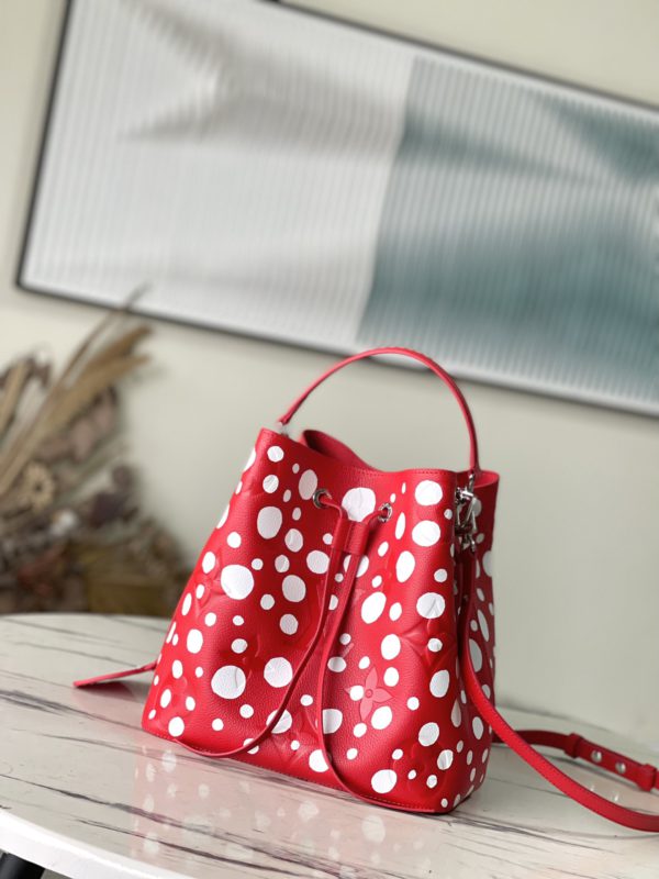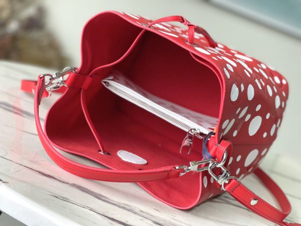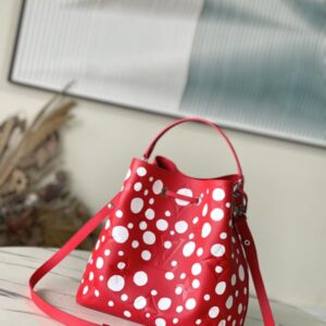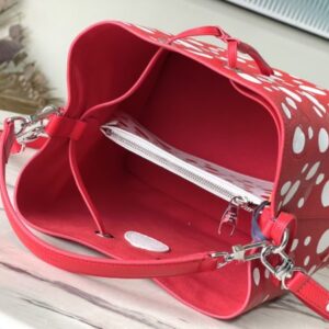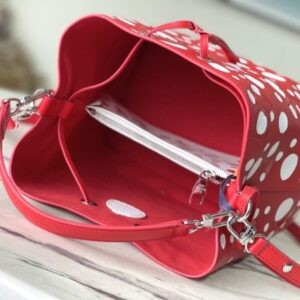 Top layer leather red dot LV x YK NéoNoé BB handbag from x Yayoi Kusama cooperation series, condensing the creative energy of the infinite wave point world. Monogram embossed calfskin reflects Yayoi Kusama’s signature polka dots, and the detachable pumpkin-shaped decoration adds to the artist’s visual calling card.