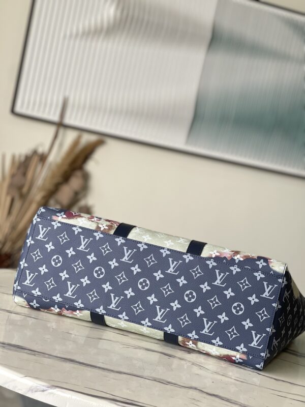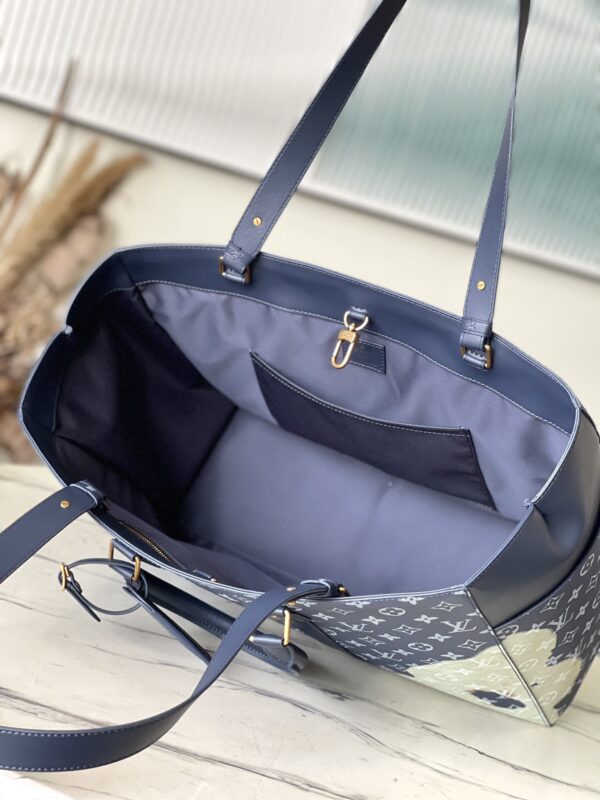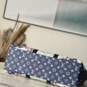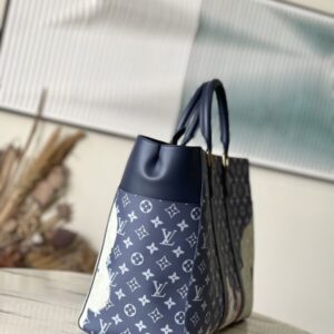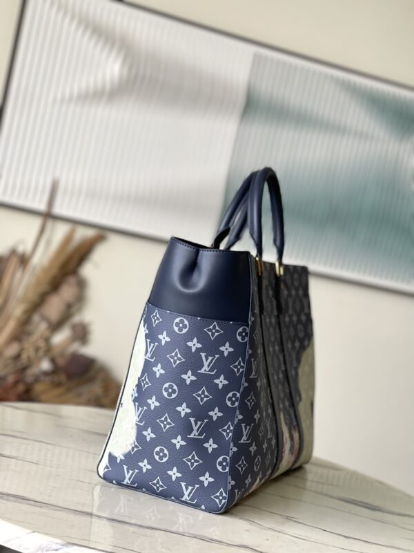 This handbag is hand-painted and slightly faded, and then embossed with the Monogram pattern. Generous capacity combined with flat handles and adjustable shoulder straps.