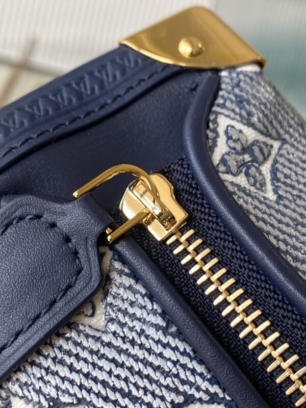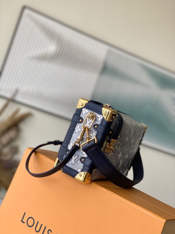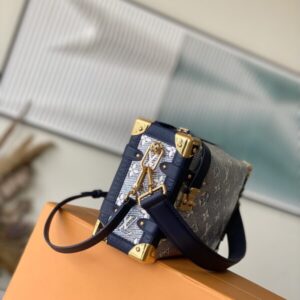This Side Trunk handbag is an eye-catching new work inspired by Nicolas Ghesquiere’s classic suitcases. The Monoglam canvas body is made from a laminated jacquard base fabric woven with cotton and decorative threads for an almost holographic visual effect. Metal wrapped corners, an S-lock closure, and colorful trim enrich the details.