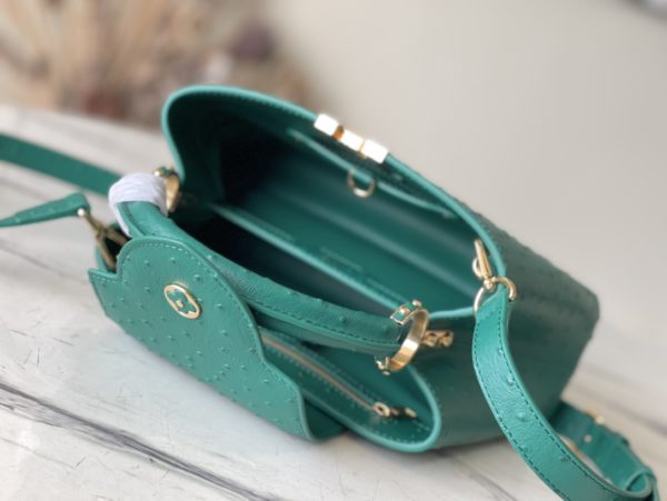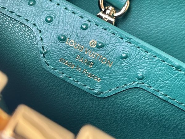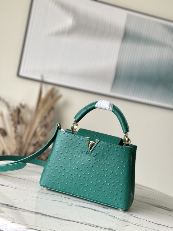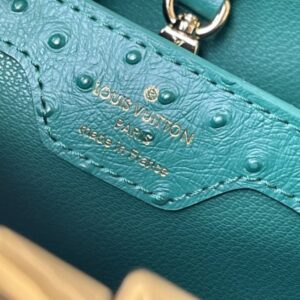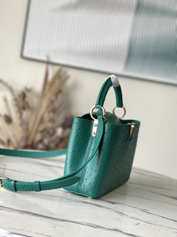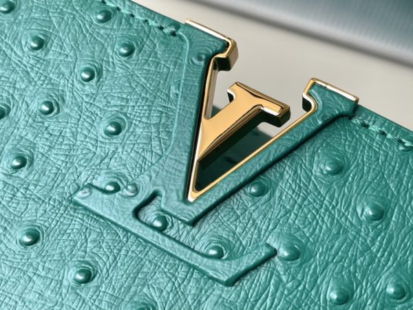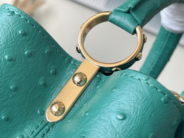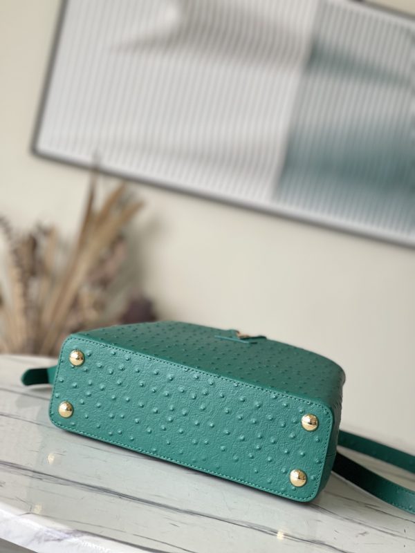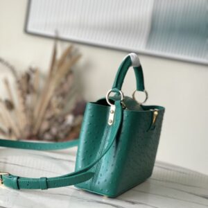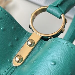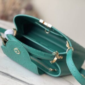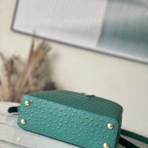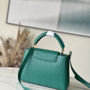 Green ostrich leather small Capucines ostrich leather handbag, moderate hardness handle, gorgeous buckle connecting the handle, spacious and practical shape, etc. The drop cover can be used in two ways, and it can be placed outside the bag to show the fashion trend of the Monogram flower pattern.
