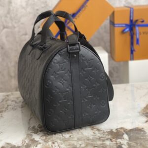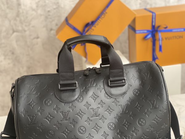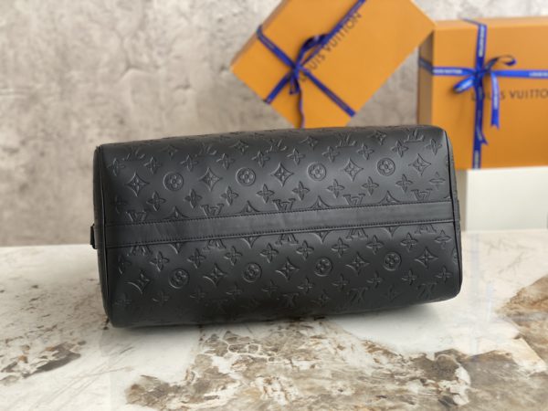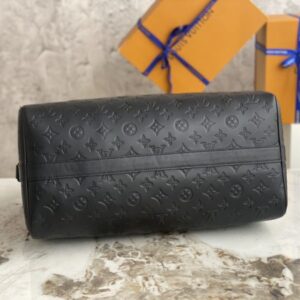 Embossed full leather travel bag series handbags. This Speedy 40 handbag is decorated with the LV upside-down logo created by menswear art director Kim Jones. The fabric shoulder strap and the top handle can be carried on the shoulder or hand-held.