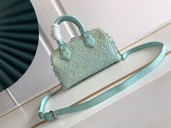 This Speedy Bandoulière 20 handbag reveals subtle luster in new season colors. The classic shape, rolled leather handle and key holder recall the design elements of Louis Vuitton luggage in the 20th century, and the detachable chain and leather shoulder strap can be carried on the shoulder or cross-body.