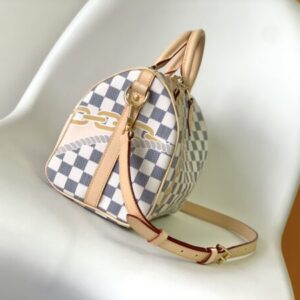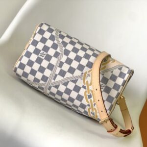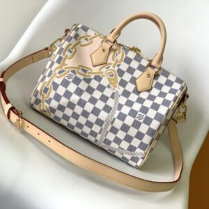 This Speedy Bandoulière 25 handbag adopts five-color silk screen printing technology, and the nautical printing composed of chain and rope patterns is drawn on the surface of Damier Azur canvas, slowly blowing midsummer breath. Use the rolled leather handle and detachable and adjustable shoulder strap to explore more ways to carry it.