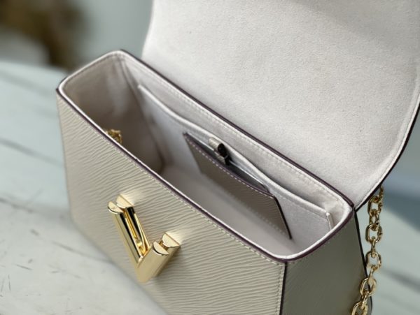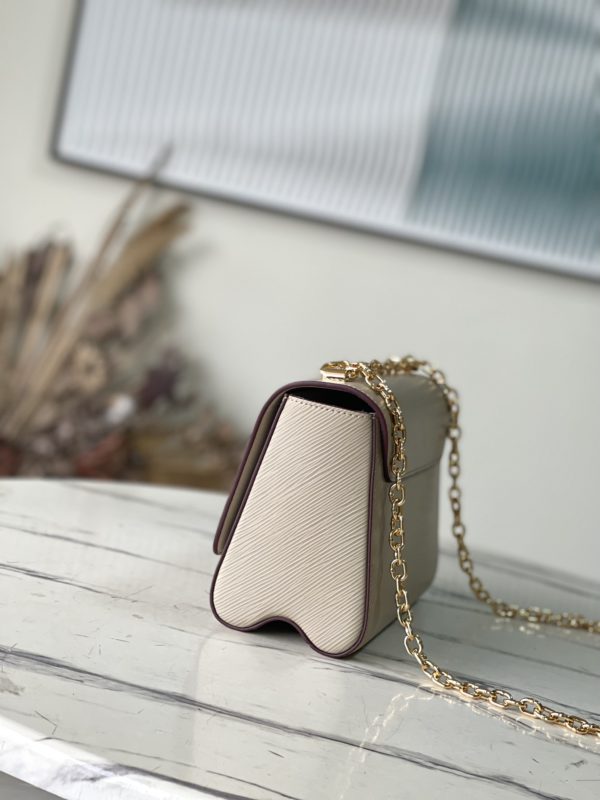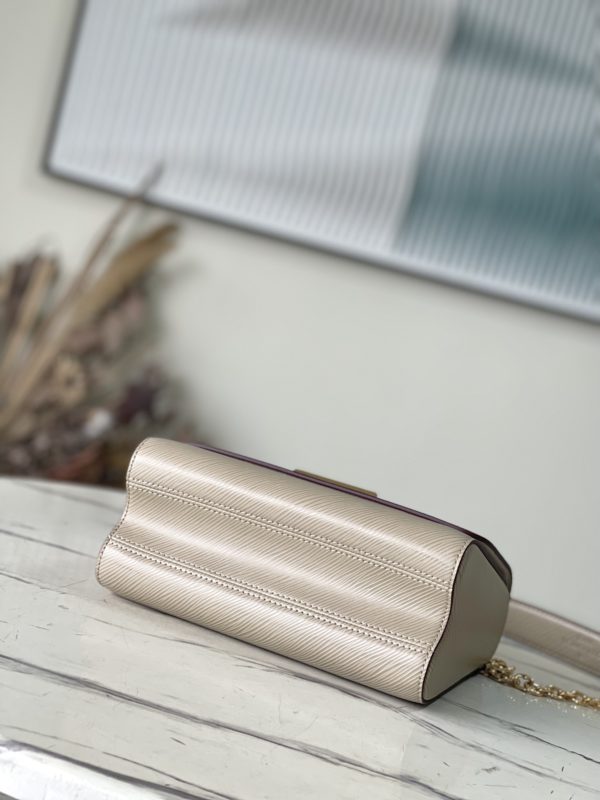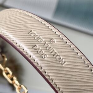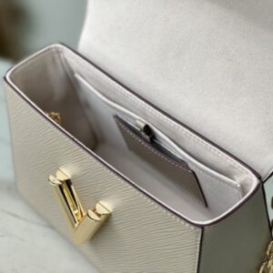 Elephant gray Twist handbags debuted at the 2015 Cruise early spring show and became a new classic of the brand. The Twist Medium Chain Bag is crafted from iconic Epi leather with an LV Twist lock in shiny metal. The wavy bottom cleverly builds ample space, and the sliding chain shoulder strap can be folded over the shoulder or unfolded across the body, making it easy to shine on day and night occasions.