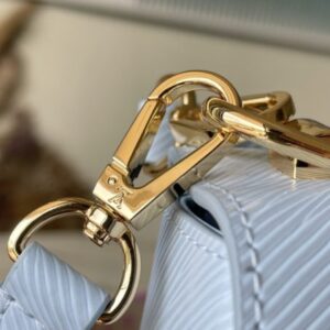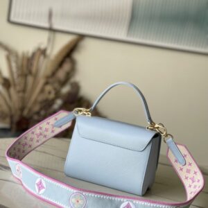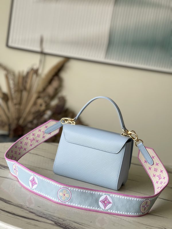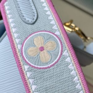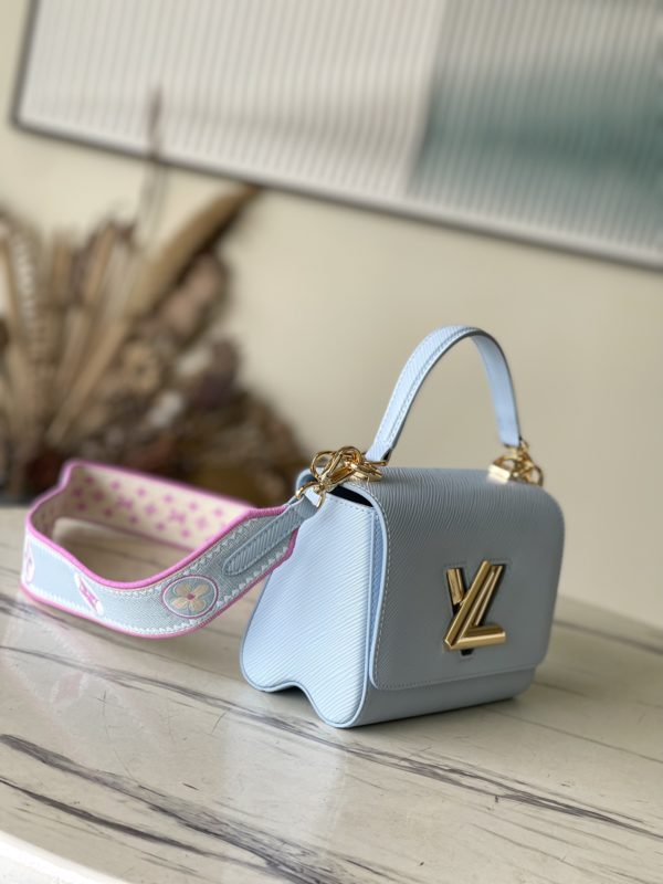 This Twist small handbag is made of Epi grain leather. The two sides of the detachable wide fabric shoulder strap depict an enlarged version of the Monogram flower and a pocket size of the Monogram pattern. presentable.