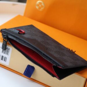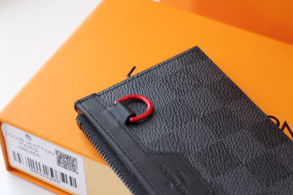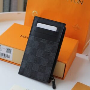 Unlock the scattered small object storage technique in a trendy way. Damier Graphite canvas with leather trim and sporty metal D-rings, card slots, zip pocket and compartment that stores bills flat.
