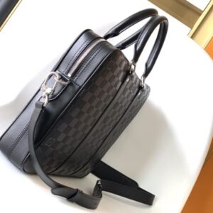 This Voyage small briefcase is made of Damier Graphite coated canvas, with leather side straps, reinforced corners, top handles and nameplates. An exterior pocket is convenient for smartphone storage, a padded interior compartment can hold a 13-inch laptop, and the detachable and adjustable shoulder strap provides comfortable shoulder carry.