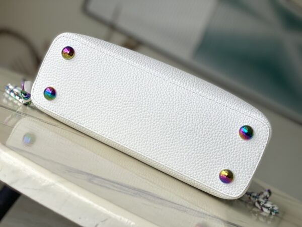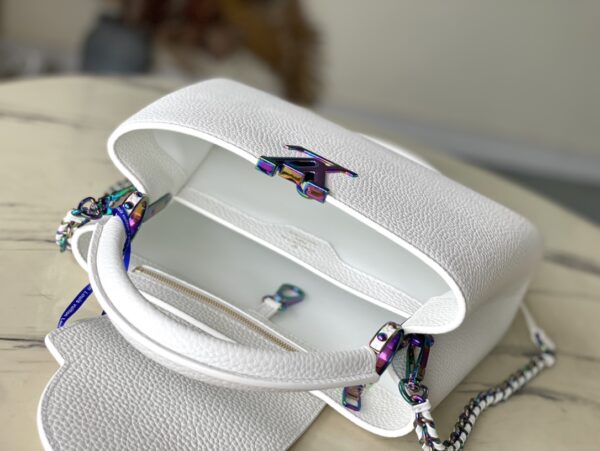 Capucines BB handbag gives colorful colors to the LV letters and woven chain, which contrasts with the simple and elegant style of the Taurillon leather bag. The jewelry-like handle rings and rivets continue the lustrous color, while the metal hardware adds bright details.