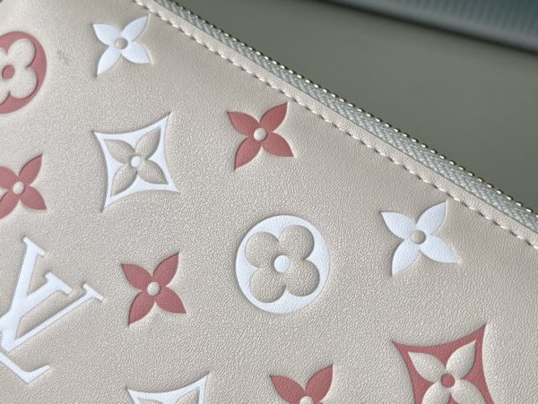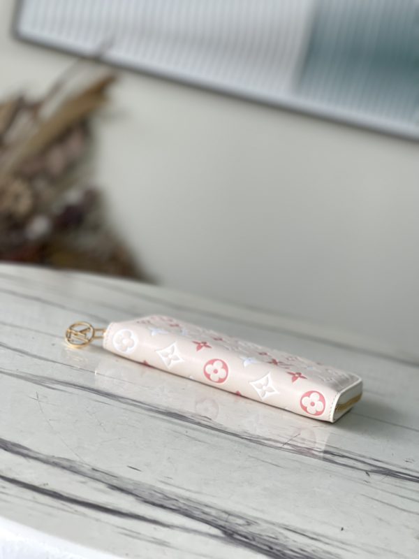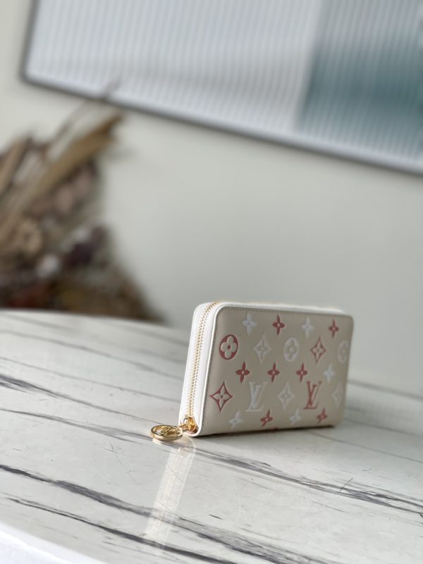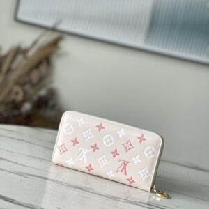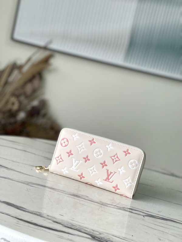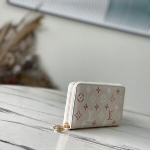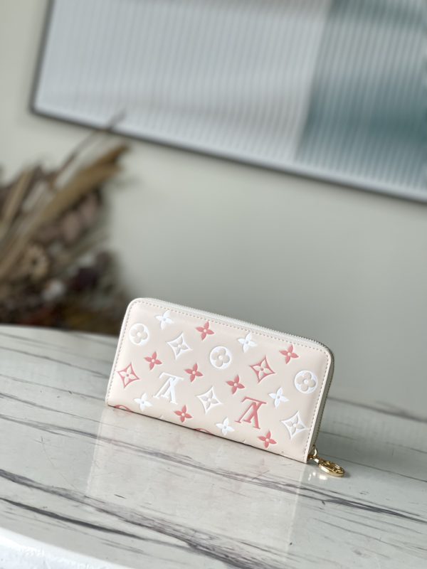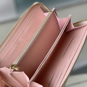 New product first release Zippy zipper wallet with pink Monogram cowhide embossed printing – feminine tone. Everyday functional wallet with multiple compartments, pockets, card slots.