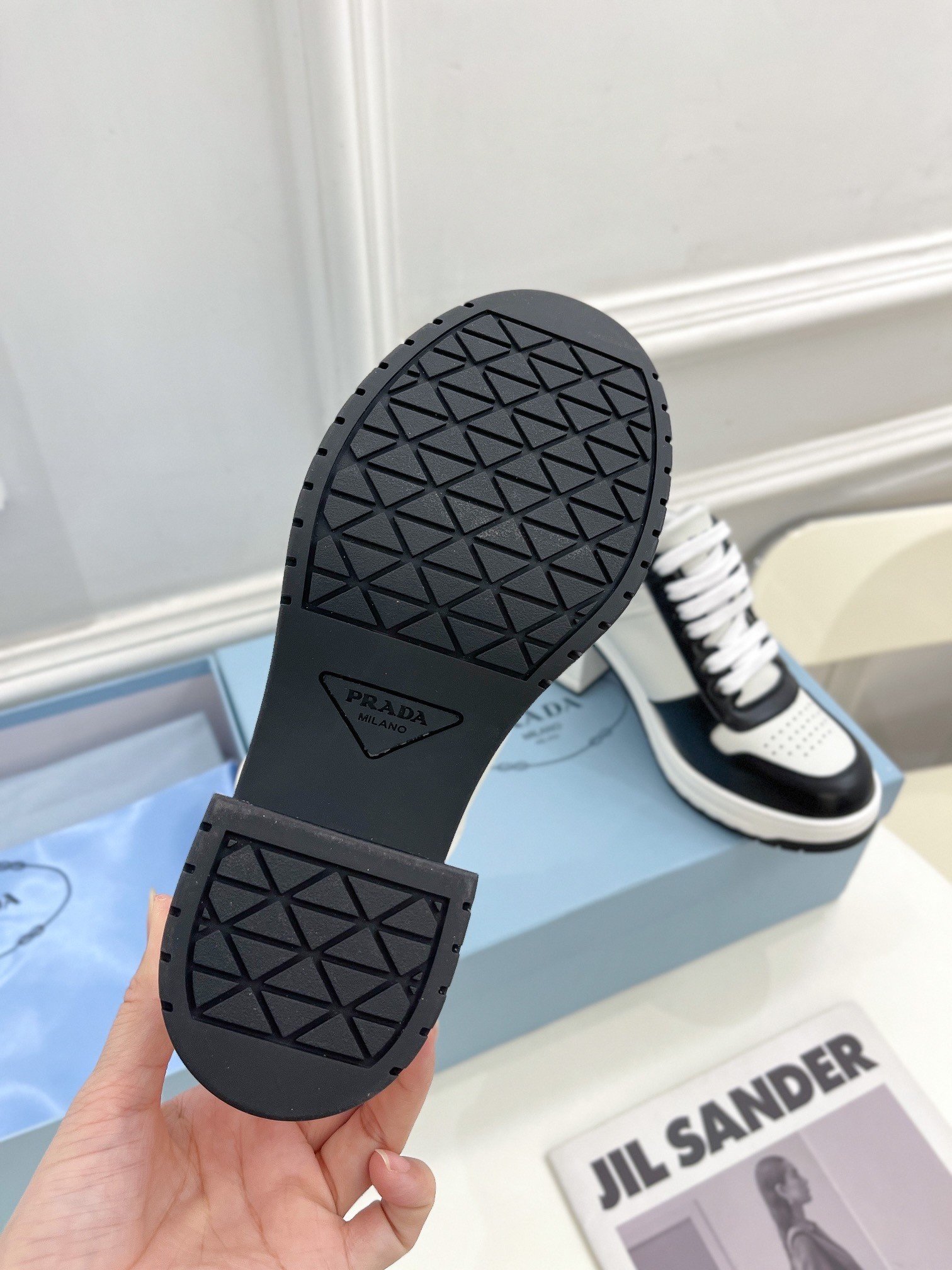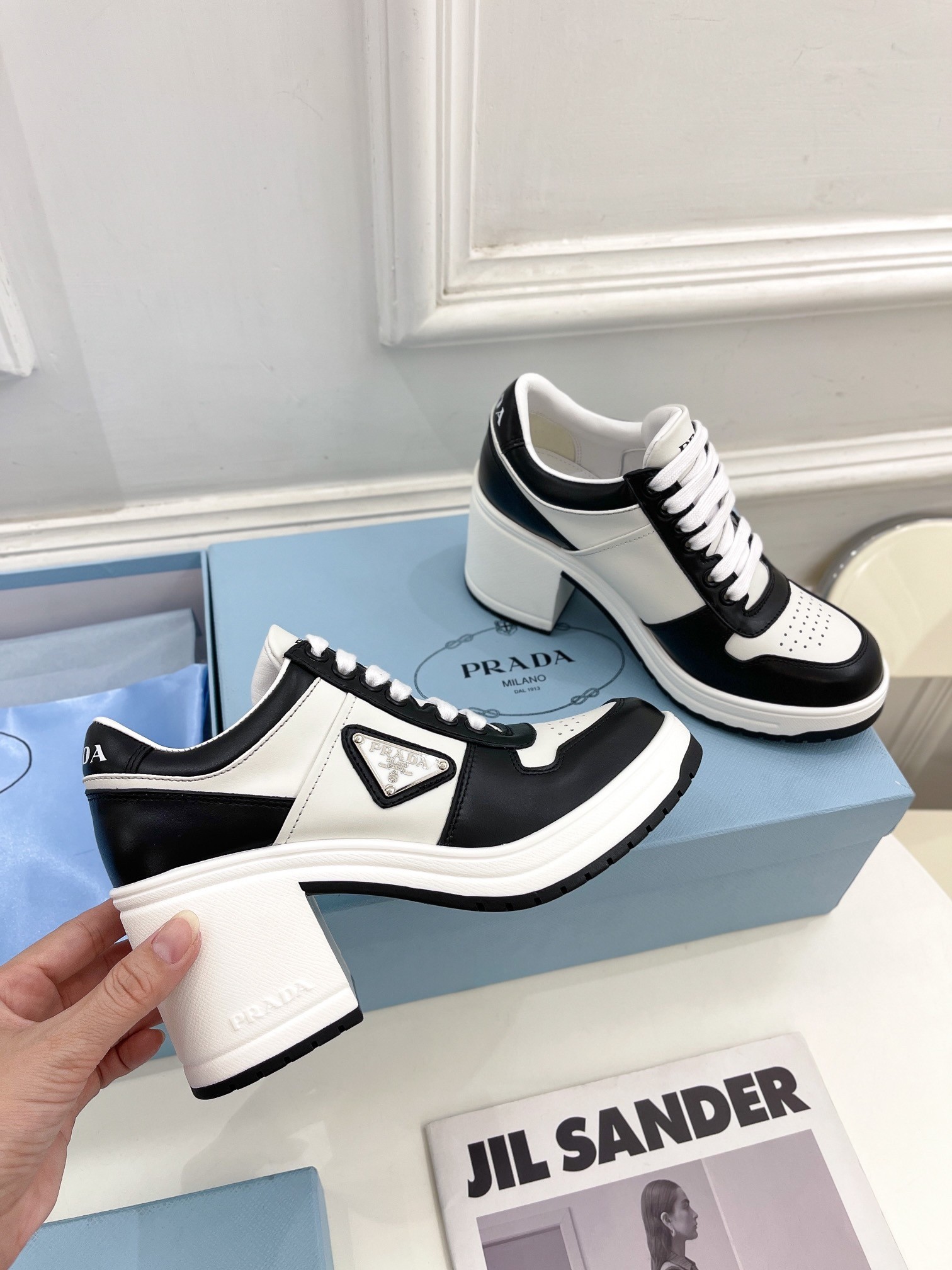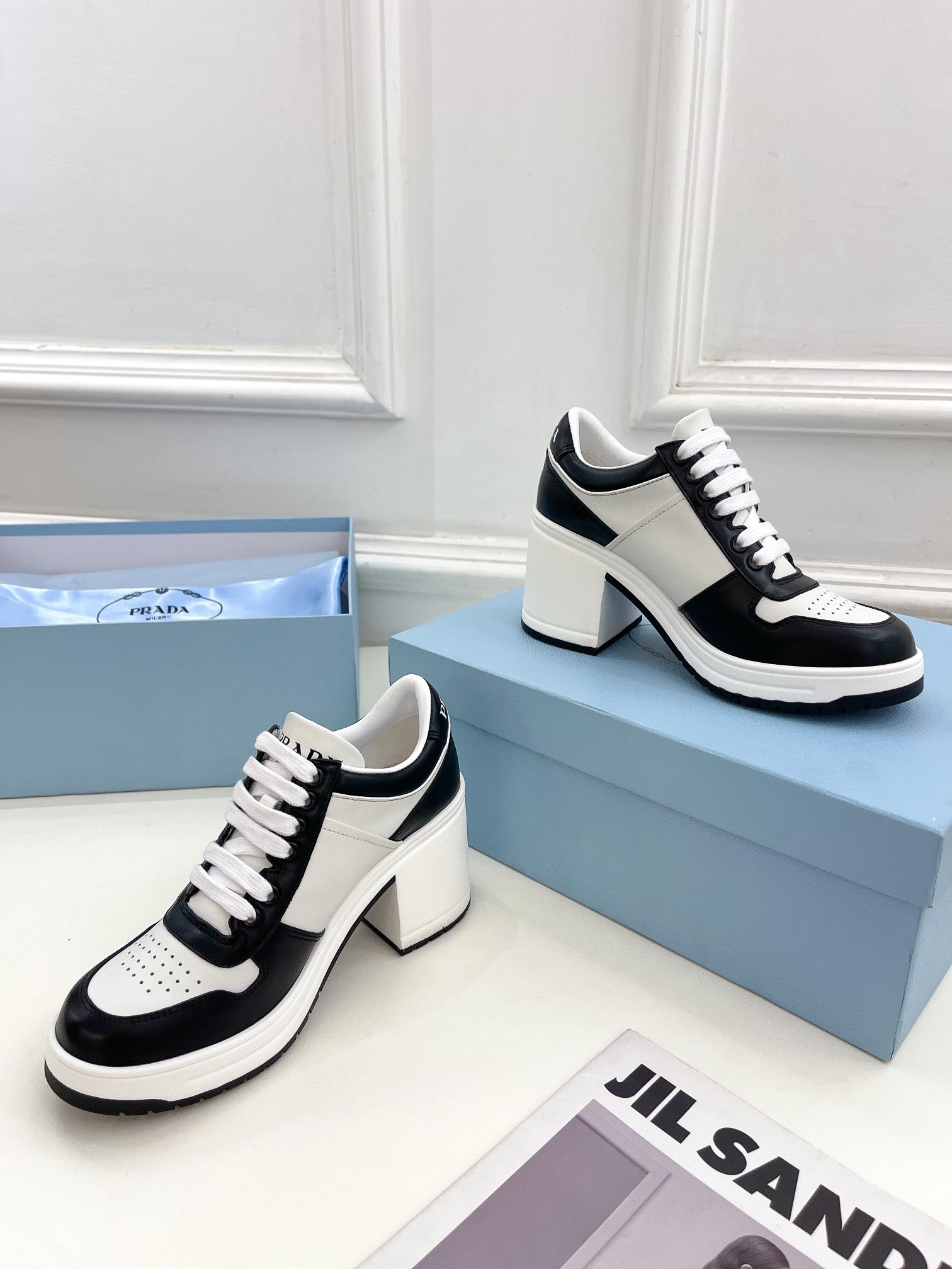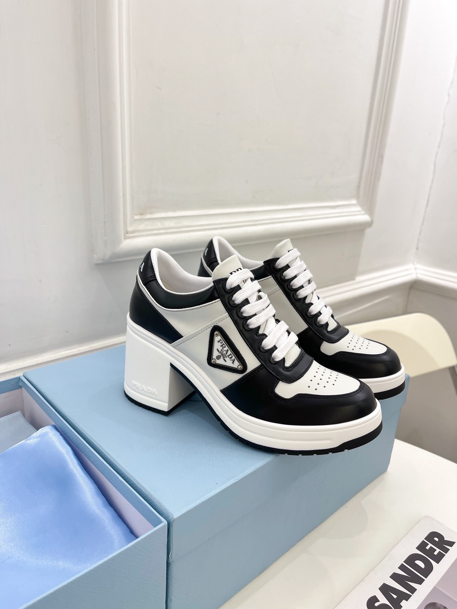 Prada Downtown High-heeled Sneakers in Black and White Leather