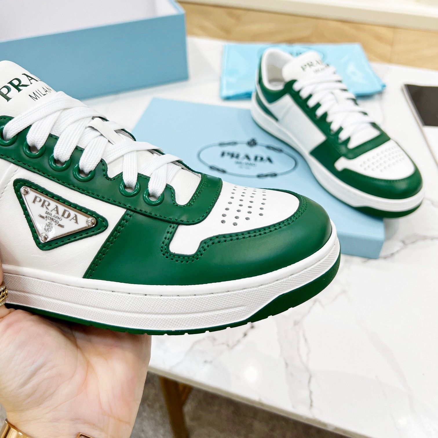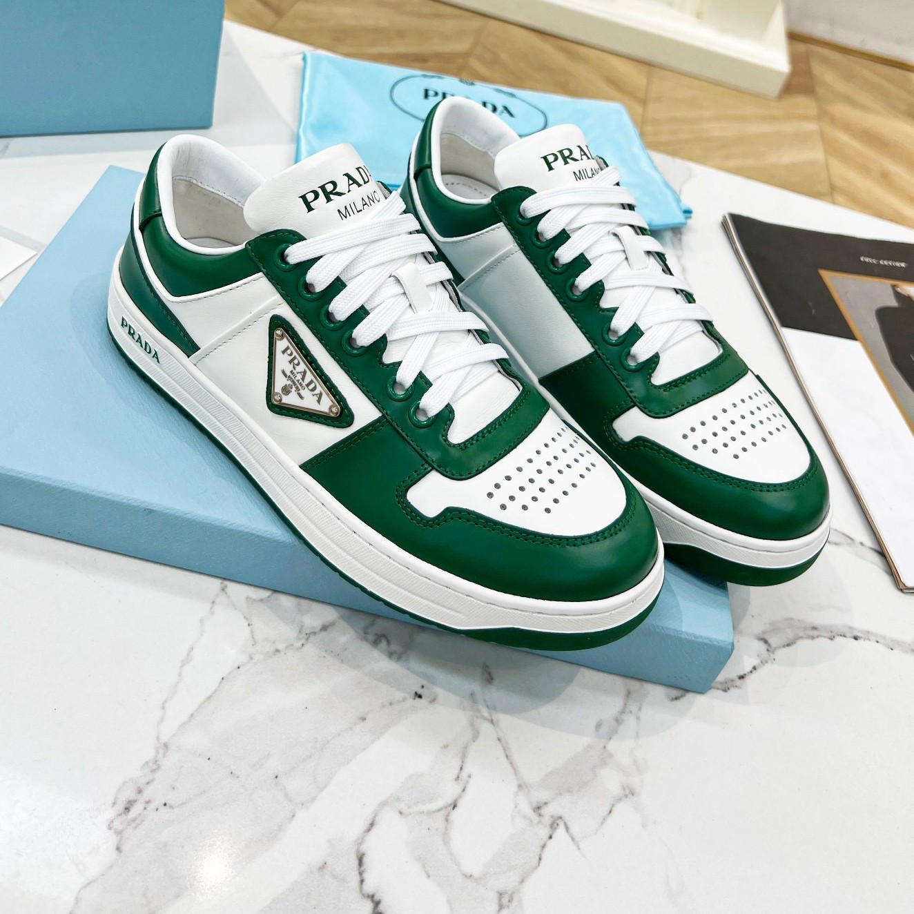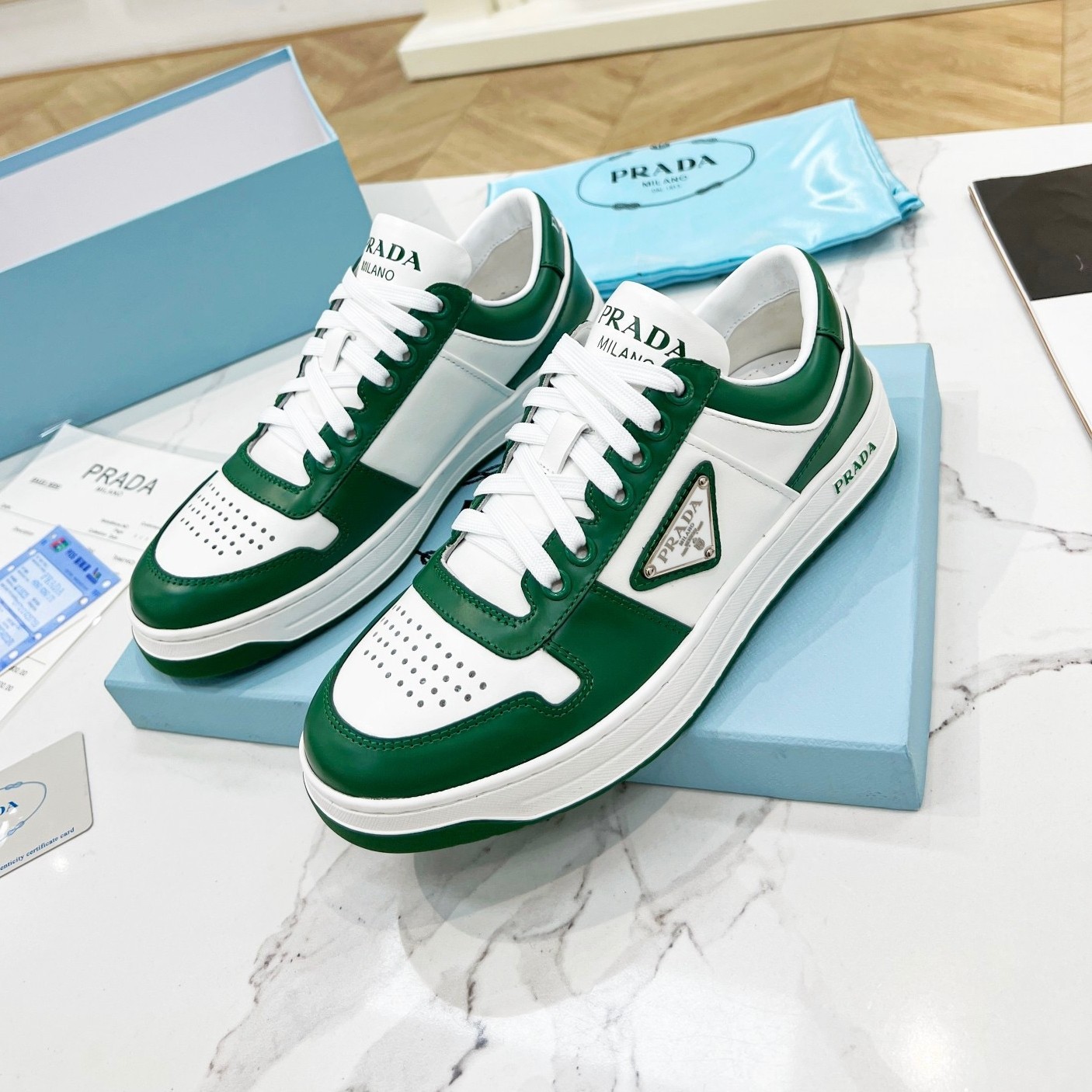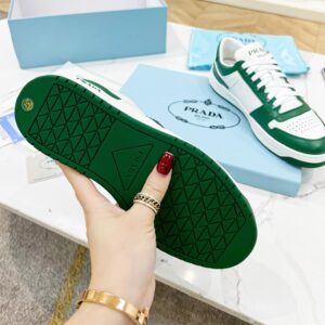 Prada Downtown Sneakers in White and Green Calfskin