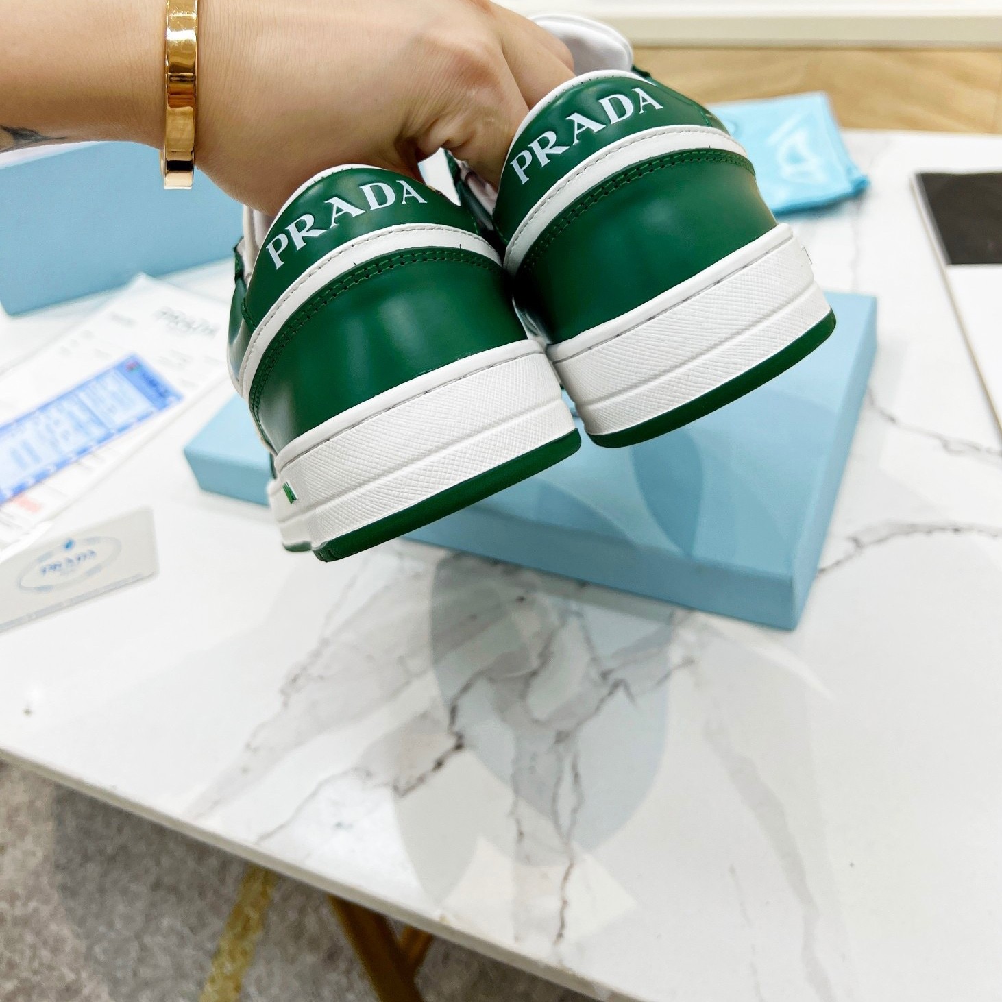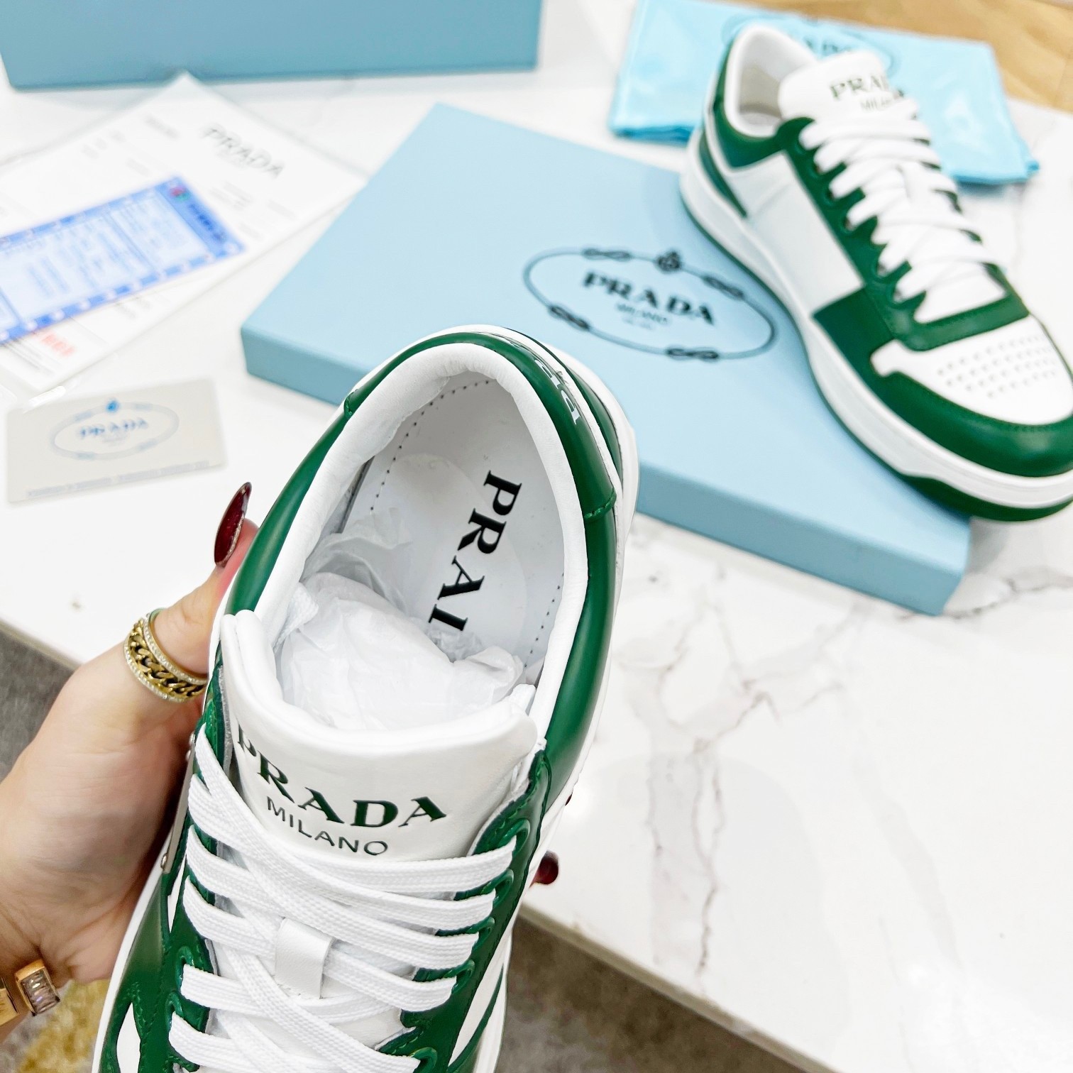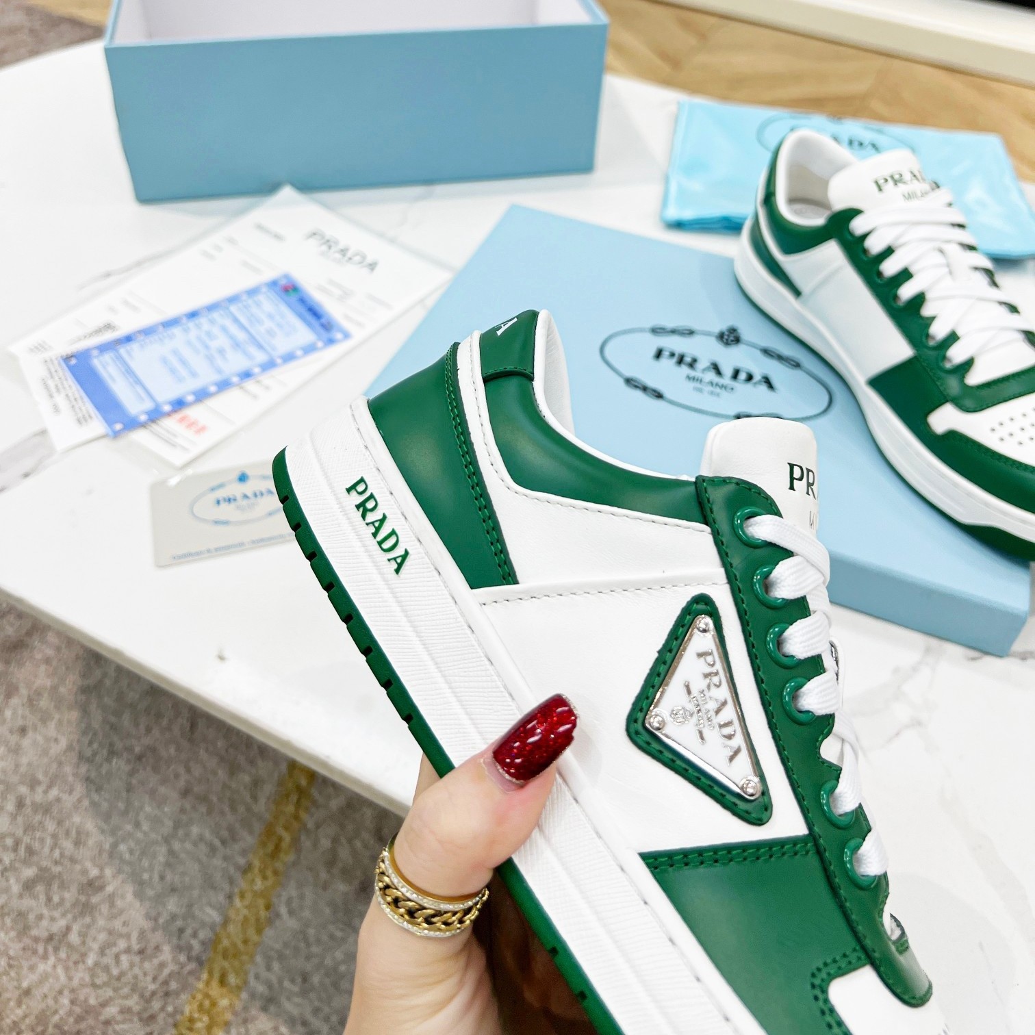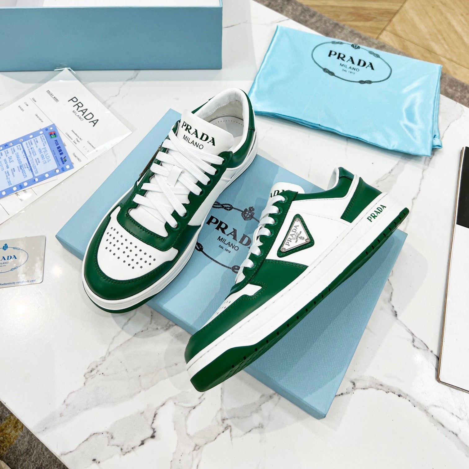 Prada Downtown Sneakers in White and Green Calfskin