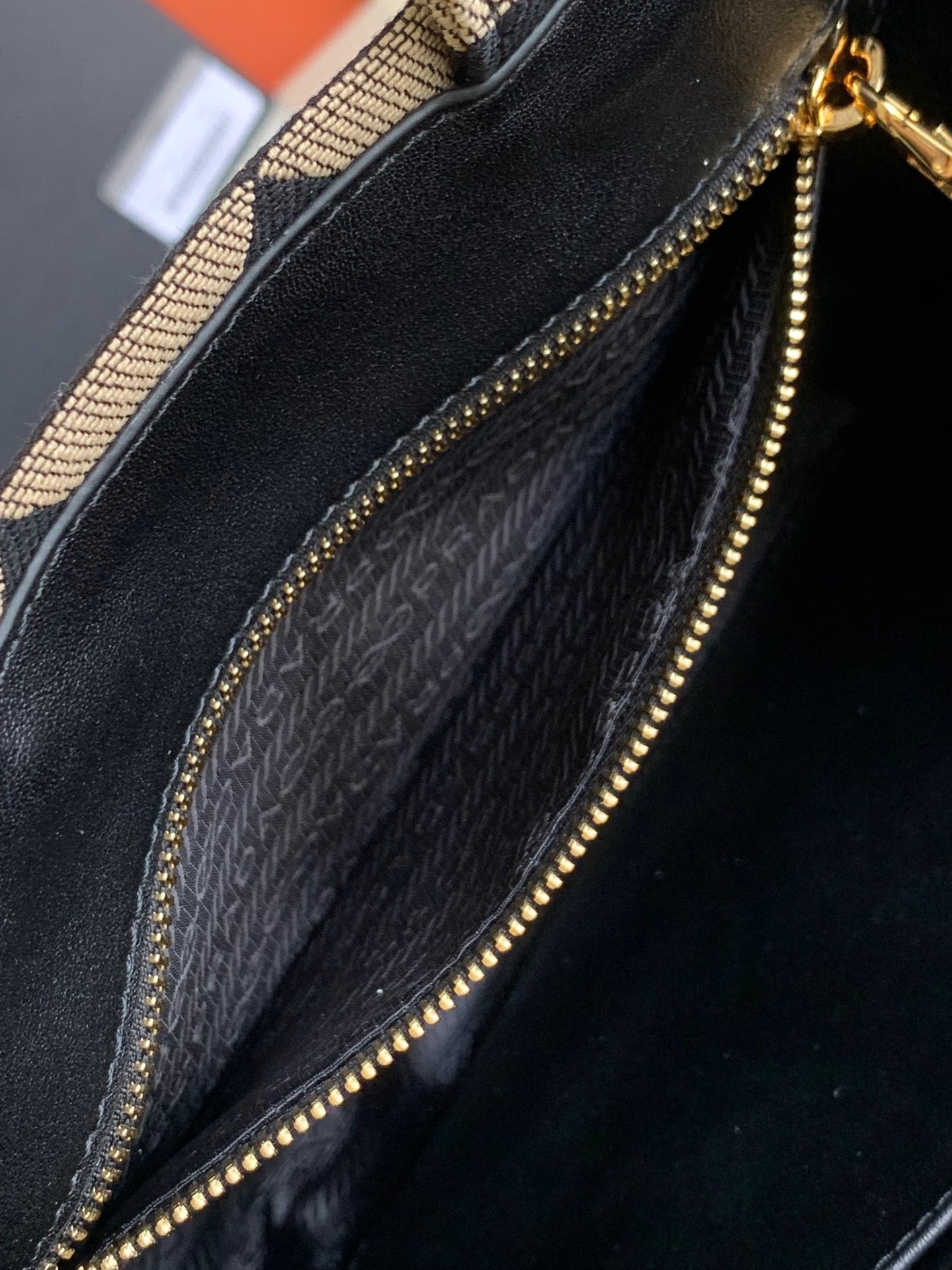 – Prada logo-print nylon lining with two pockets, one with zipper