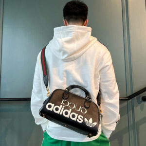 Part of the adidas x Gucci collection, this mini duffle bag features the ‘Gucci adidas’ and Trefoil print. adidas and Gucci venture into a collection, where the Web juxtaposes with the three white stripes, and the GG monogram combines with the trefoil. Pulling inspiration from the Creative Director’s memories of the ’80s and ’90s, emblematic House’s motifs mix with those of the historic sportswear brand adidas resulting in a series of hybrid looks.