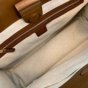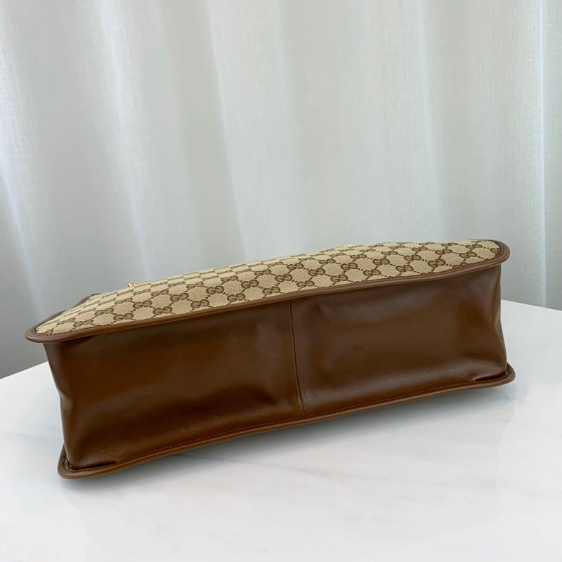 Designed with rounded edges and a soft shape. the tote bag is introduced to the Gucci 1955 Horsebit collection for Spring Summer2020. Made from GG Supreme canvas with brown leather trim. the large double-handled silhouette has a chain shoulder strap that complements its modern spirit. finished with an organizational interior and magnetic snap closure. The collection unifies details first introduced on the original bag that inspired the line from over six decades ago with a modern spirit. highlighting the Horsebit. Part of Gucci’s genetic code. the double ring and bar design has been established as one of the most distinctive elements among the House symbols borrowed from the equestrian world.