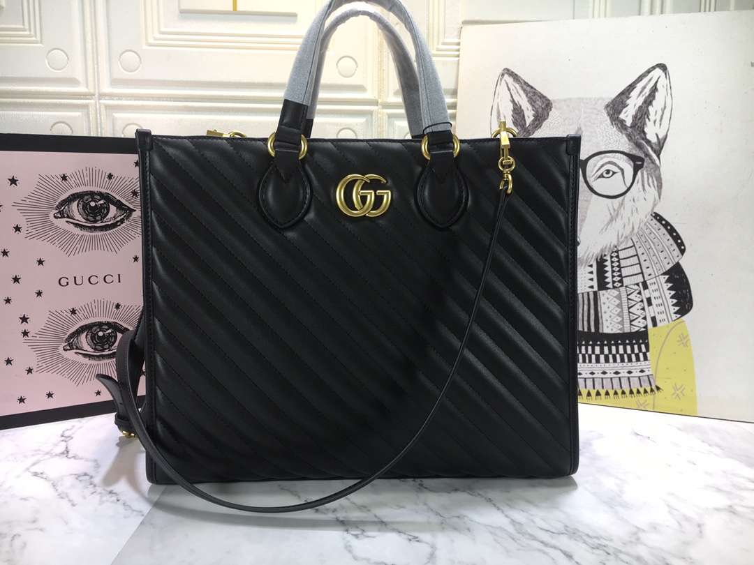 Introducing the Gucci AAA-Marmont medium tote bag. a stylish and practical addition to the GG Marmont line. Crafted from black matelass?? leather. this tote features antique gold-toned hardware and a microfiber lining with a suede-like finish. What sets this bag apart is its use of an alternative chrome-free tanning process. reducing its environmental footprint compared to traditional methods.